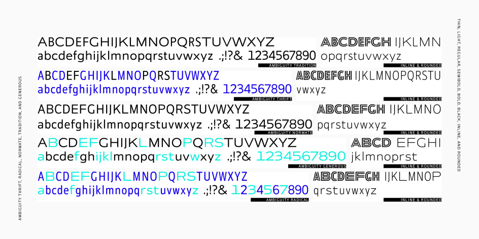 Incidentally, while variable fonts and the variable font format were essential tools in the development of Ambiguity, ultimately we decided to release it as individual OpenType "expressions" of the full variable spectrum to make it easier to use. It will become a variable font again—when the graphic-design tools and time are right.