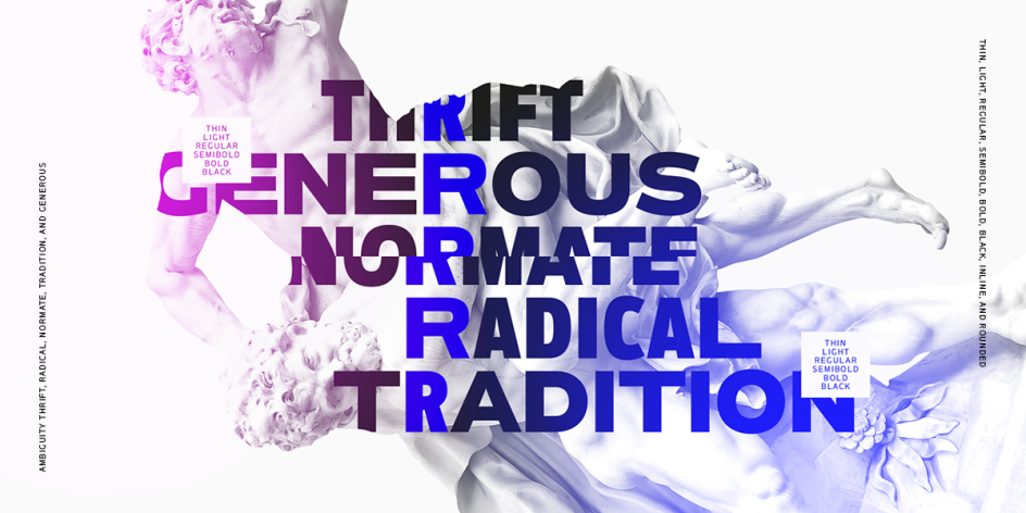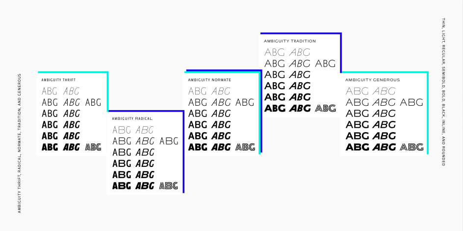 Ambiguity aims to celebrate both upholding the tenets of good type design and react against them. Featuring five different states – Tradition, Radical, Thrift, Generous and Normate – it offers a range of perspectives across the spectrum from conformist to contrarian.
