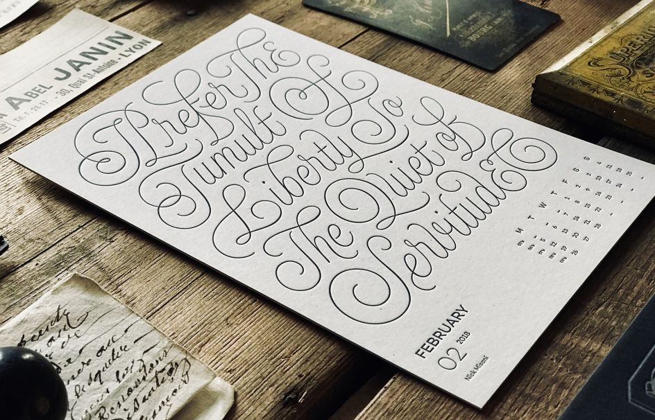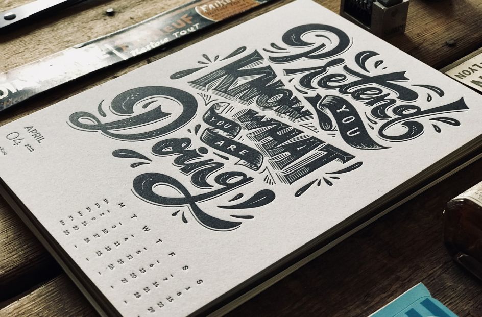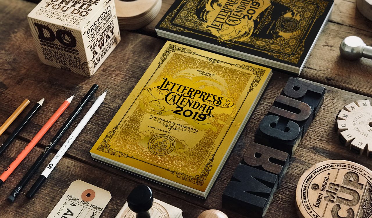 Each month of the 2019 edition will feature motivational words of wisdom for creatives, designed by typographers and graphic designers including Nick Misani, Ginger Monke (Tom Lane), Dan Grett, Peter Voth, Kelsy Stromski, Christian Watson 1924.us, Tuyet Duyet, Reno Orange. The front cover, with its vintage-style typography and beautiful embossed effect, is designed by Mr Cup himself.