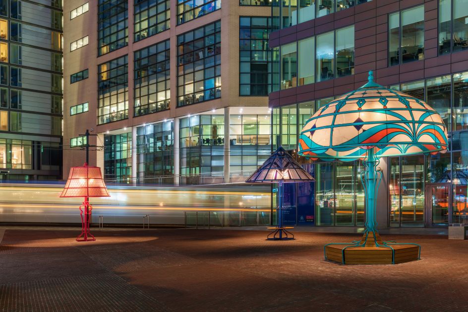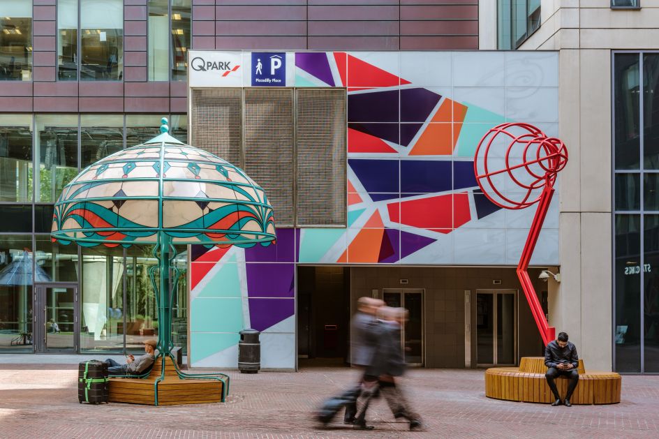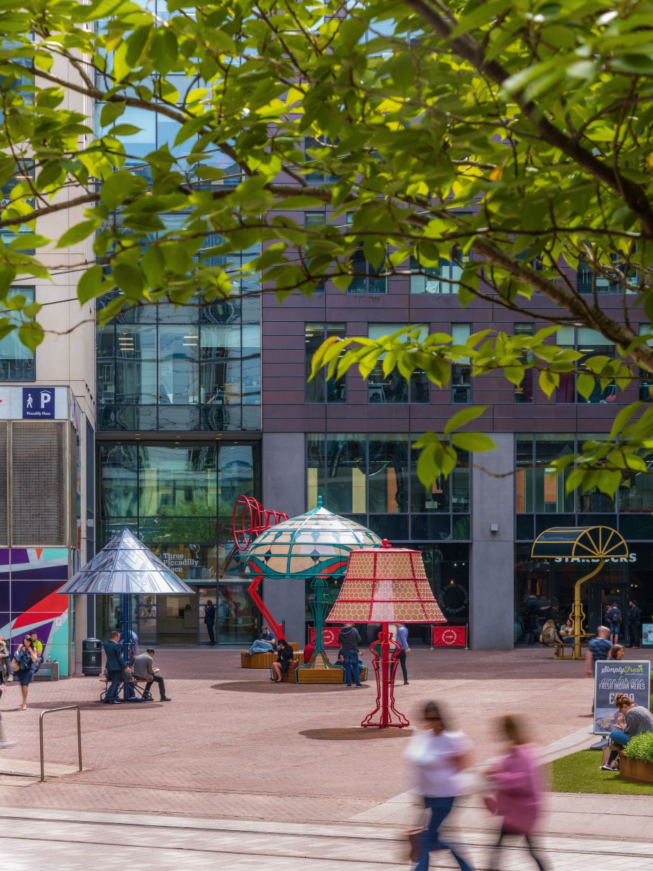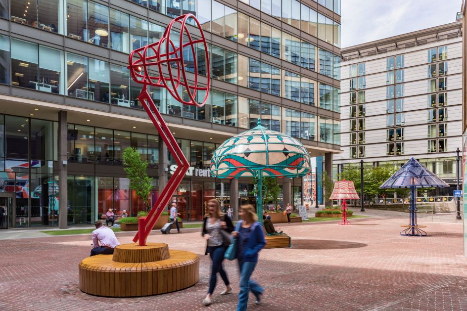Five playfully oversized lamps, reflecting various eras and centuries of innovation in Manchester, have been built in Piccadilly Place as part of plans to revamp the piazza. Ranging from 3.4m to 6m tall, the lamps have been designed by local art and design studio Acrylicize.