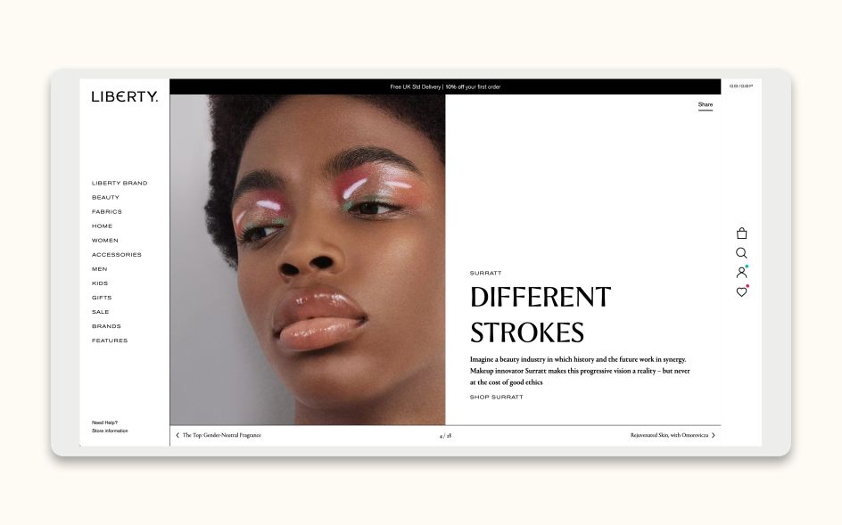 Pentagram also redrew the Liberty crest "to give a subtler, more modern effect" while retaining the much-loved icon alongside the strapline 'London 1875'. The new design strategy looks to use these assets as "embellishments to the brand rather than part of the brand itself," says the studio. "Working alongside the retail brand without dominating it, both can be used sensitively to add a sense of heritage, place or 'added' value, especially for the overseas market."