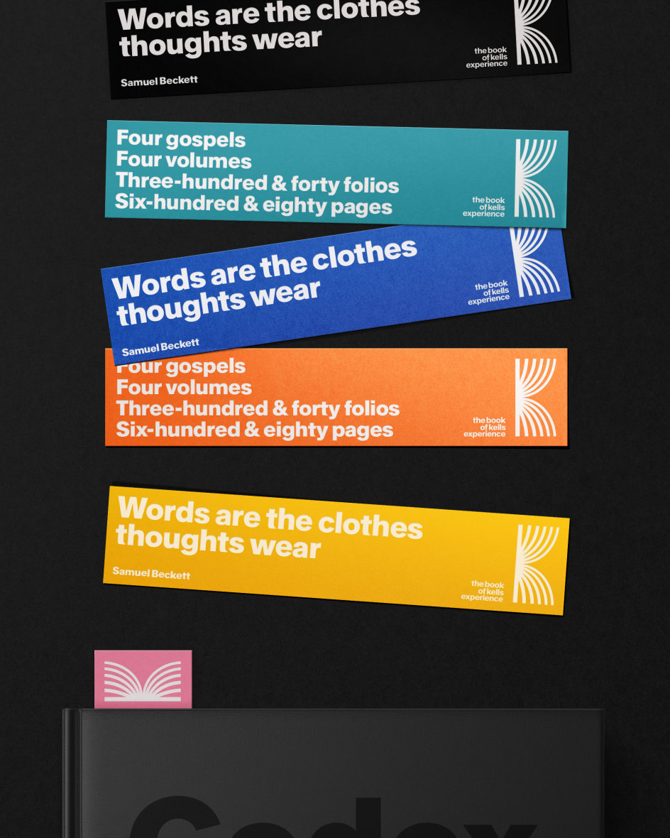 The tone of voice and campaign copy were developed by Pentagram's Brand Narrative team, led by Ashley Johnson. It aims to tell the story of the experience from the viewpoint of a visitor, with each strapline relating to a unique part of the Book of Kells Experience.
