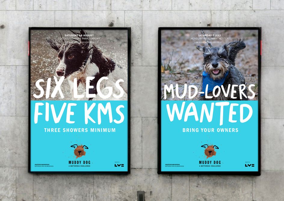 This is particularly useful for Battersea's public-facing programmes and fundraising initiatives, which lean into the joyful part of the brand personality. 'Muddy Dog', a fundraising challenge from Battersea, takes a playful spin on the master identity and uses tongue-in-cheek headlines to engage with its audience.
