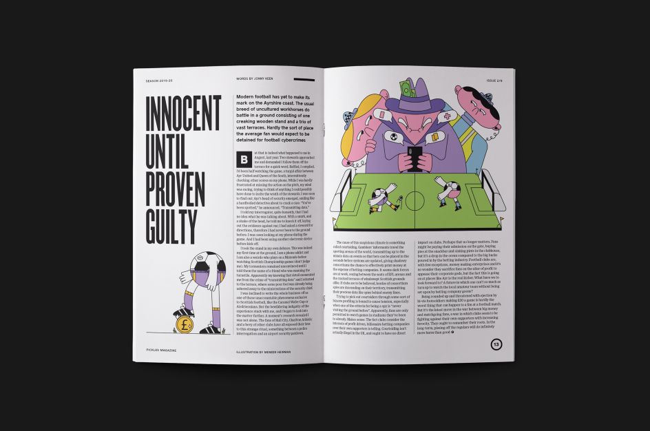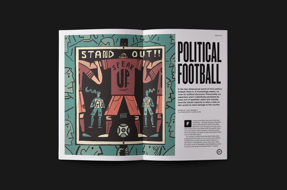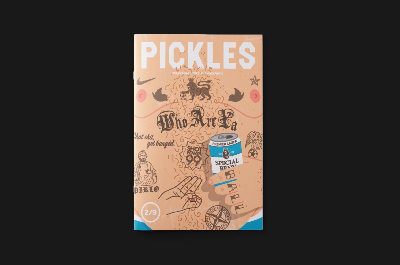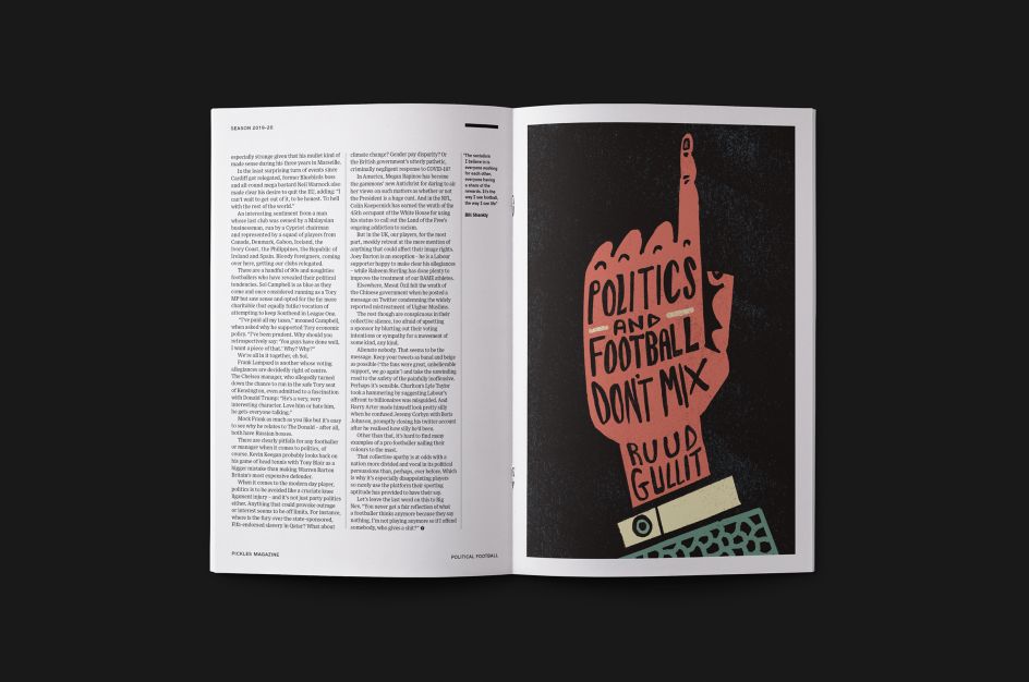 Issue 2/9 features a striking cover image by London illustrator Michael Parkin, one which reflects the circumstances of the issue's creation. "We started working on this issue as a global pandemic was declared and football pulled up the drawbridge," explains Pickles founder Ned Read. "It left us pondering the role football plays in our lives and the sense of identity it gives us. Instead of mindlessly chanting 'who are ya?' on the terraces, we decided to give it a bit more thought. So the latest issue of Pickles focuses on football and politics and why they don’t mix but maybe they should."