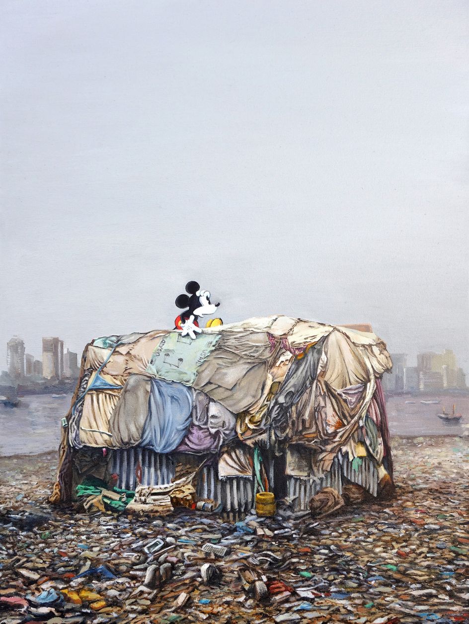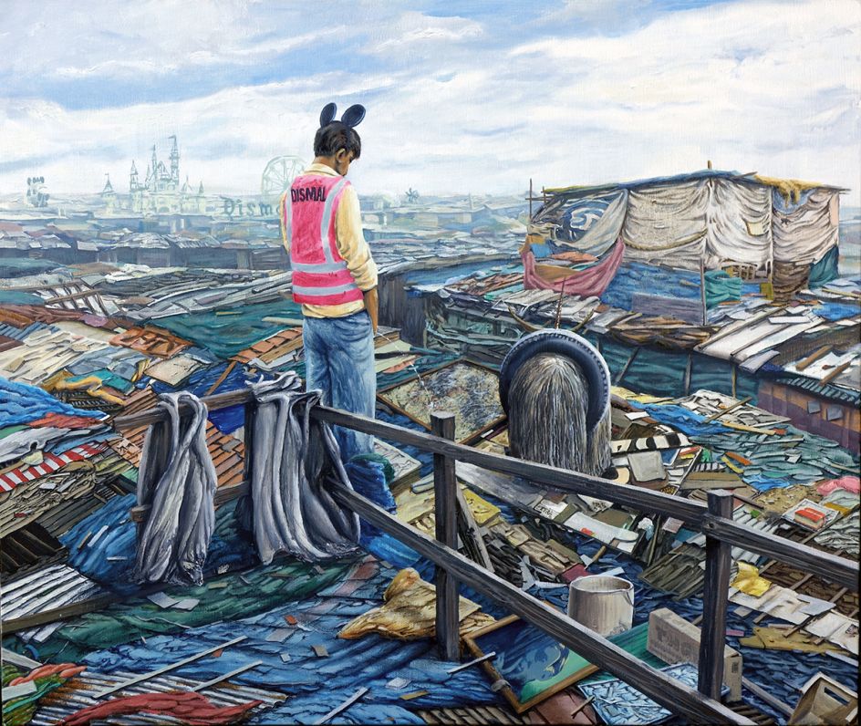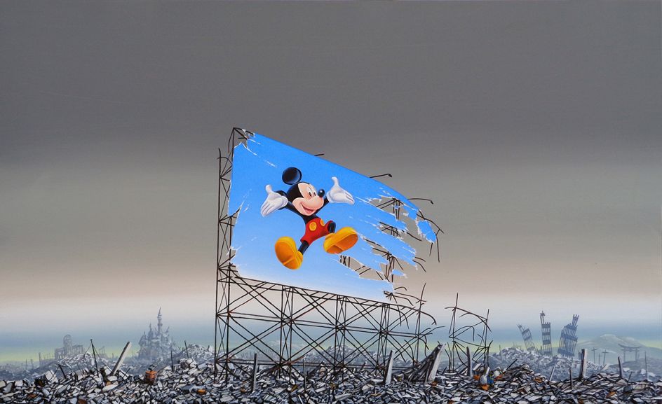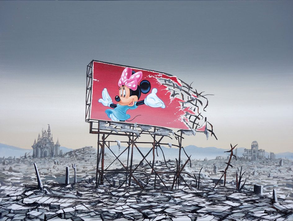 The castle’s entryway is emblazoned with the initial ‘B’ instead of ‘D’ and is surrounded by an infestation of Banksy’s ‘Minnie-Rats’. Other works show a huge landfill with a broken down London Eye, London in need of ‘Dismal-Aid’, Mickey Mouse living in a slum and Minnie Mouse on a billboard hovering over a post-nuclear Hiroshima wasteland.