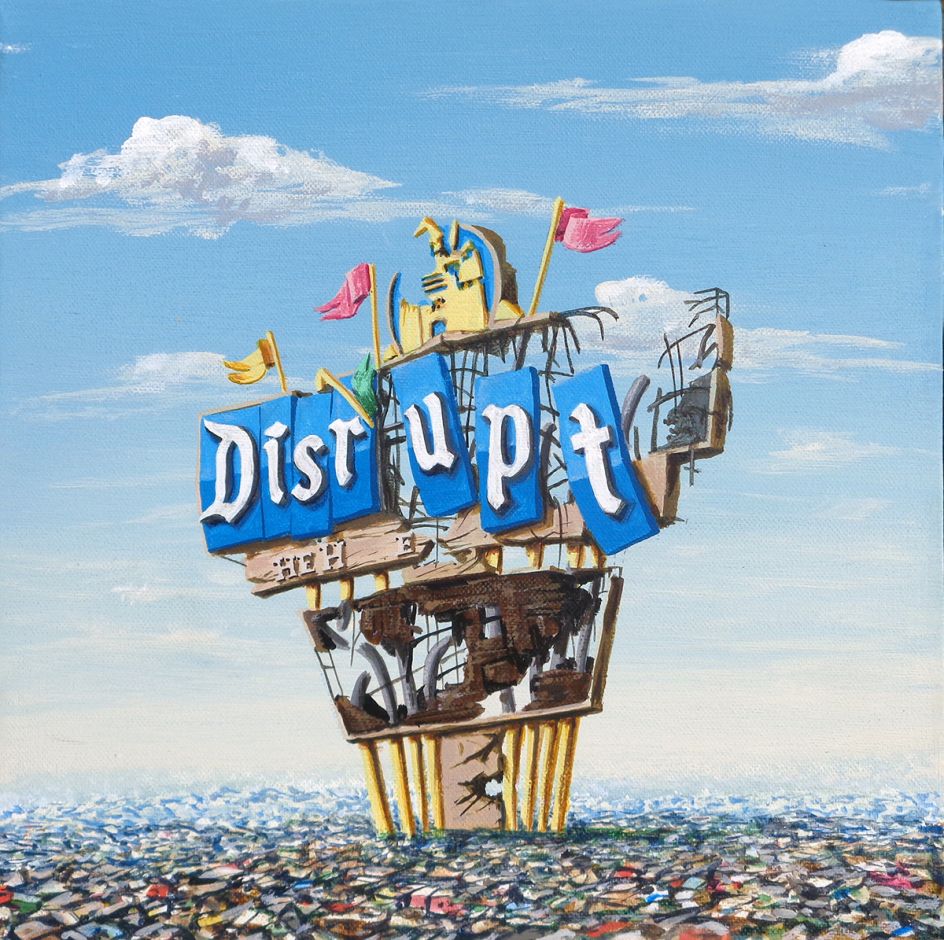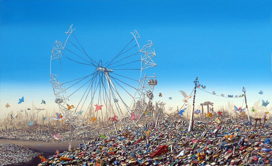 Featuring 15 paintings, this latest body of work is a continuation of the post-apocalyptic scenes he’s been creating for over 20 years. This time, however, Jeff has turned the tables on Banksy, with many scenes in his new work inspired by Dismaland.