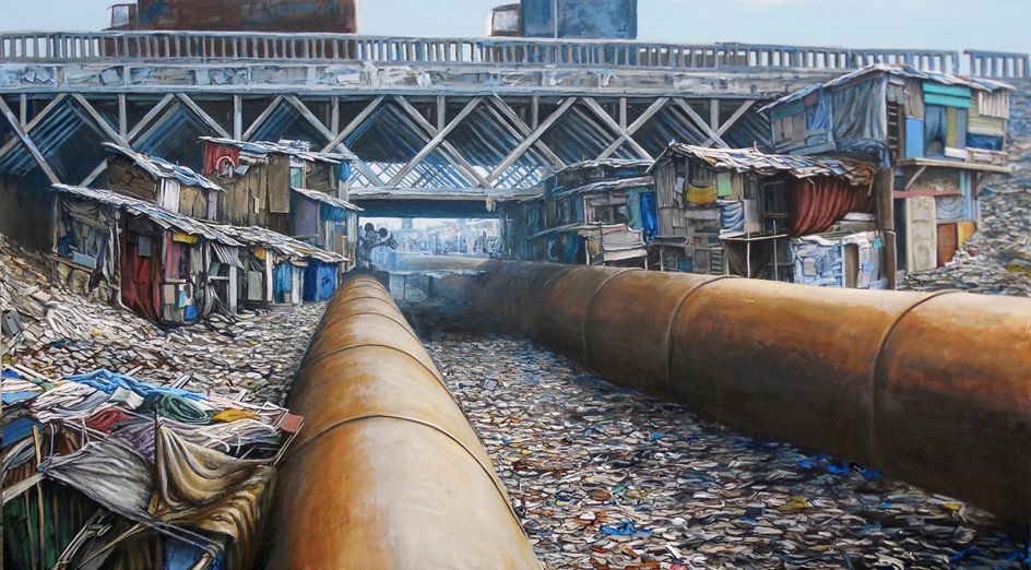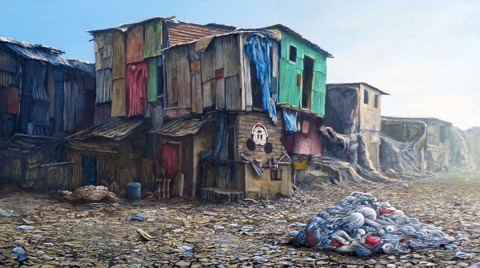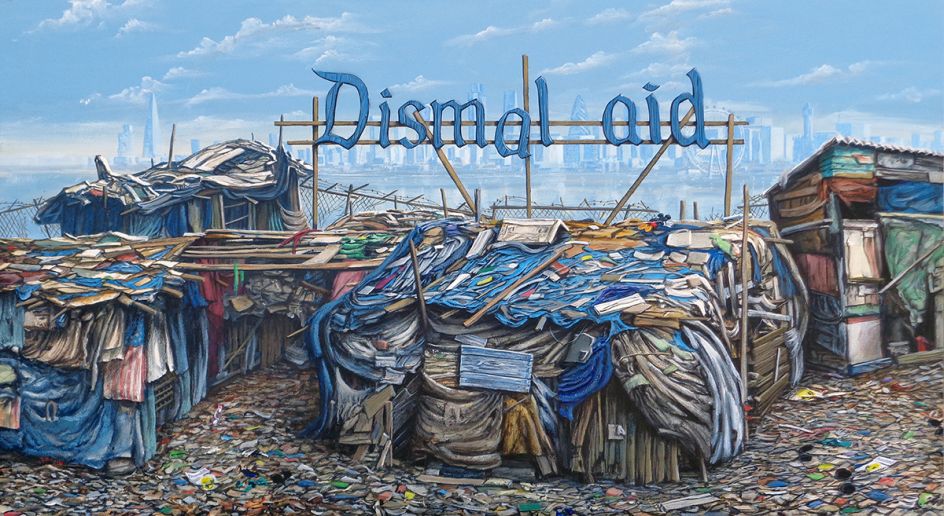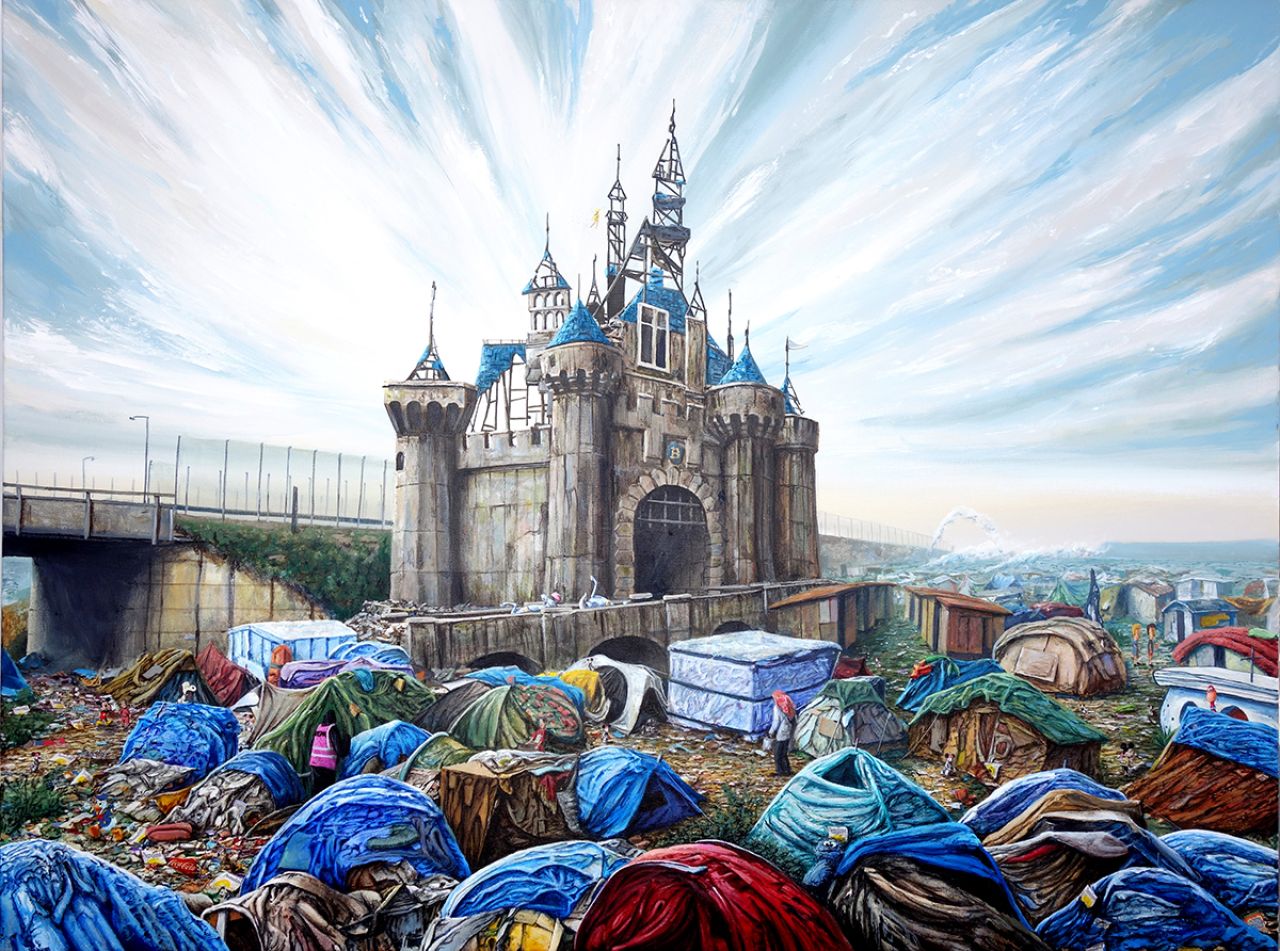 Entitled Dismaland Calais, the series is based on Banksy’s digital realisation of the Dismaland Castle, reimagined within the Calais refugee camp. In the painting Jeff adds his own surprises, Dismaland detritus scattered about amongst the ramshackle tents, tear gas canisters rolling in the background, and the occasional Dismaland employee wandering in the ‘jungle camp’.