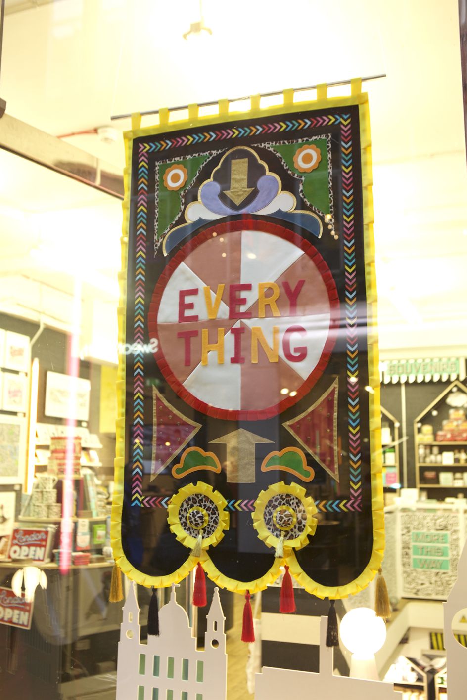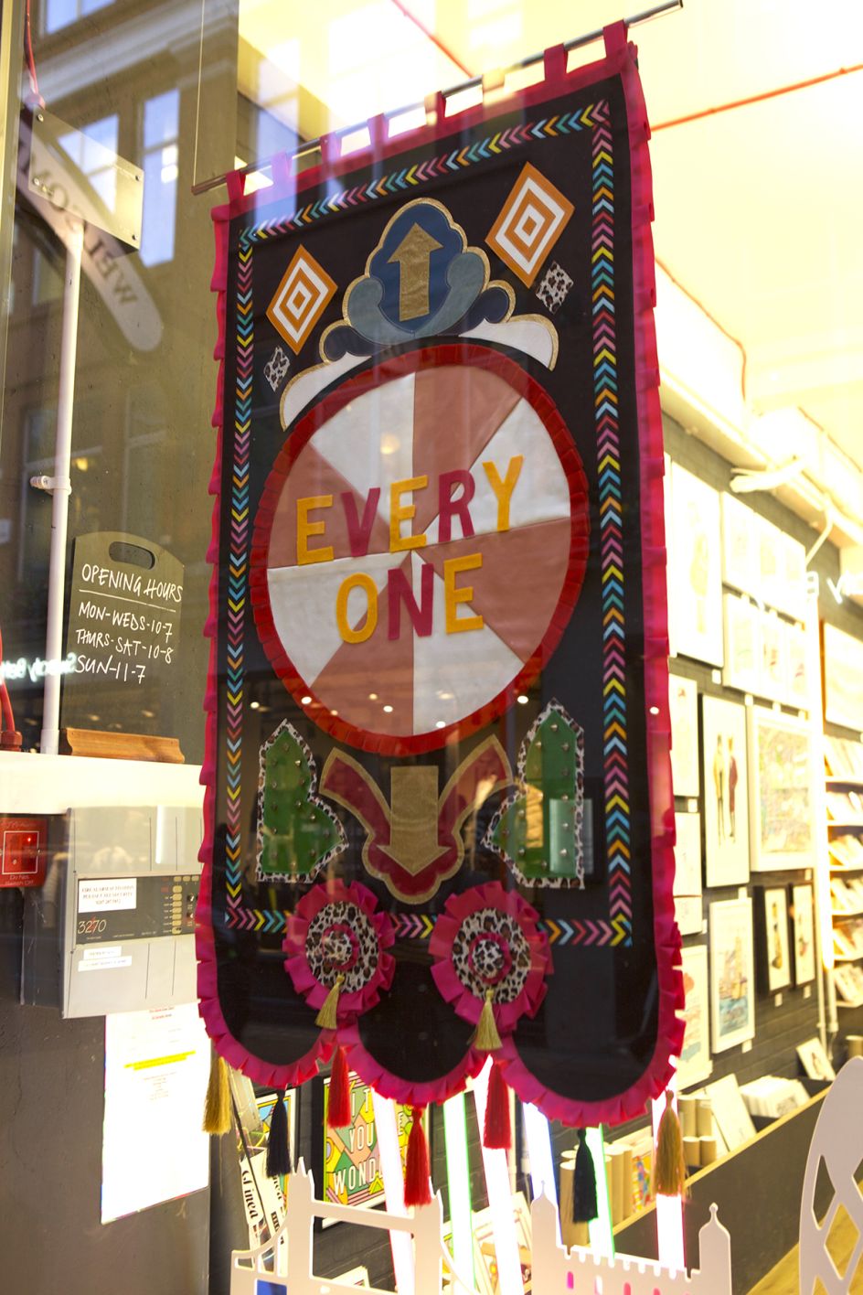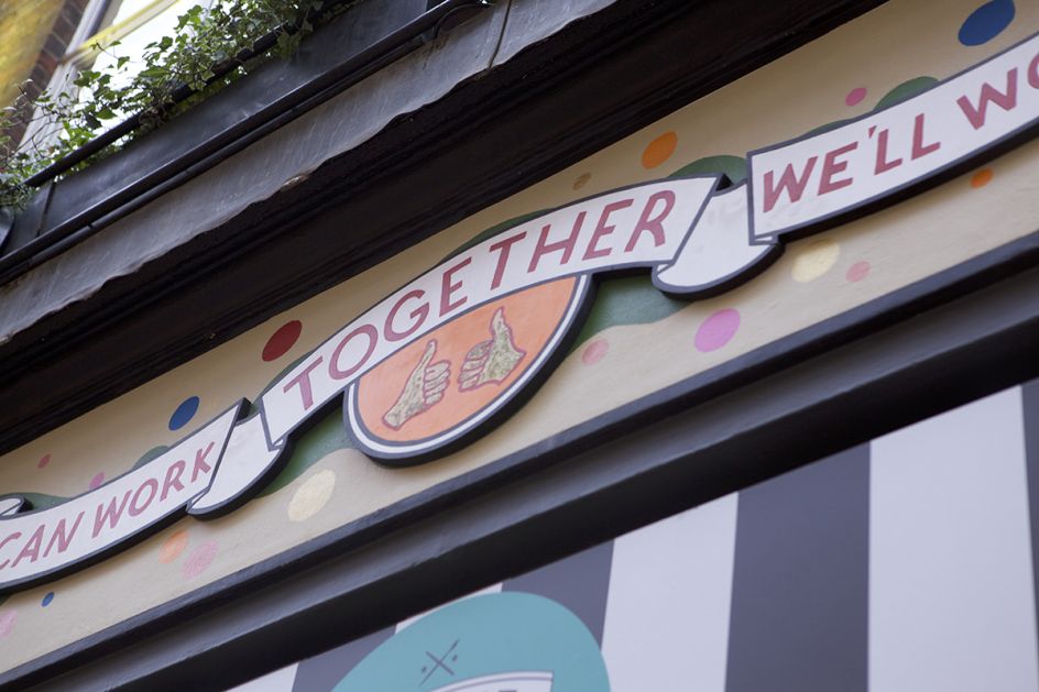 That message forms the centrepiece of a 3D banner, intricately cut out of wood and featuring the words: "If We Can Work Together, We'll Work Together". Accompanying this are two beautifully crafted embroideries hanging impressively in the shop's windows, stating "Everyone" and "Everything".