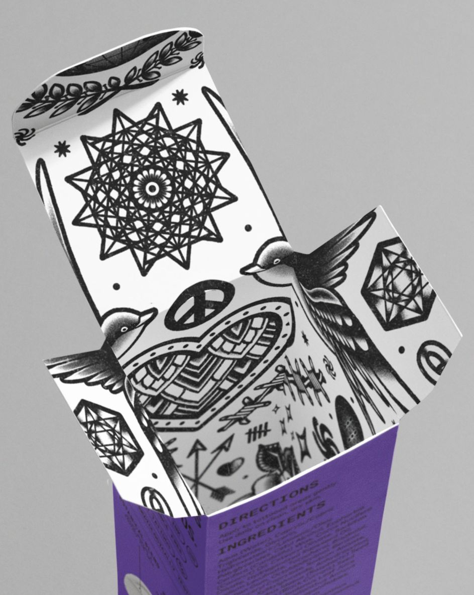 A sans serif called Engineer Black by GRIN3, and monospace font Roboto Mono by Christian Robertson were introduced to "add more personality and authority into the design and reflect the brand's progressive nature and efficacious formulations", according to the studio. These tech-influenced fonts work in tandem with Gilmore's handcrafted illustrations, which are synonymous with traditional tattoo culture.