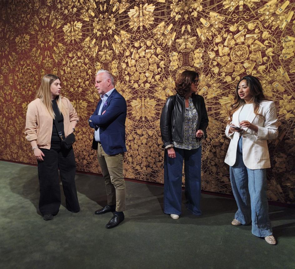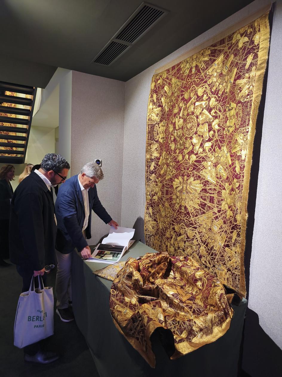Entering the first room was like stepping inside a textile firework. It was lined with silk lampas in deep red and gold, and as your eyes adjusted, the pattern revealed itself: surveillance cameras, handcuffs, Twitter birds, llamas. The second room was devoted to Finger, Ai's famed middle-finger motif, rendered in a double-face silk that reversed red and orange depending on which side you were viewing. Both funny and furious, it was as neat a summary of his practice as you could hope for.