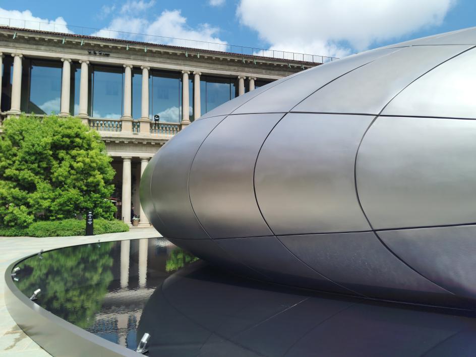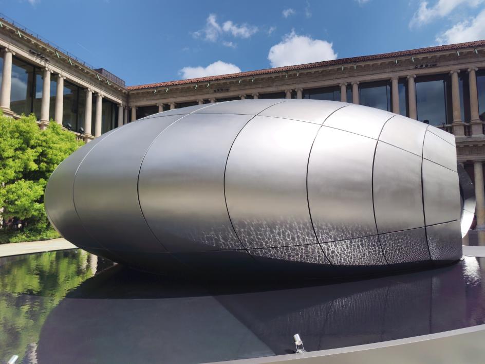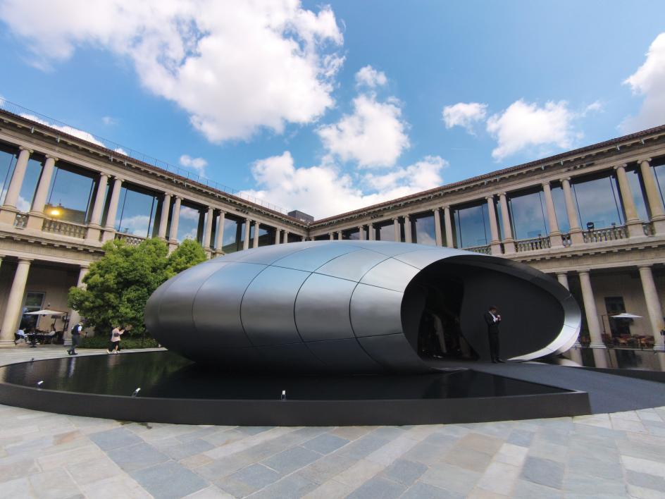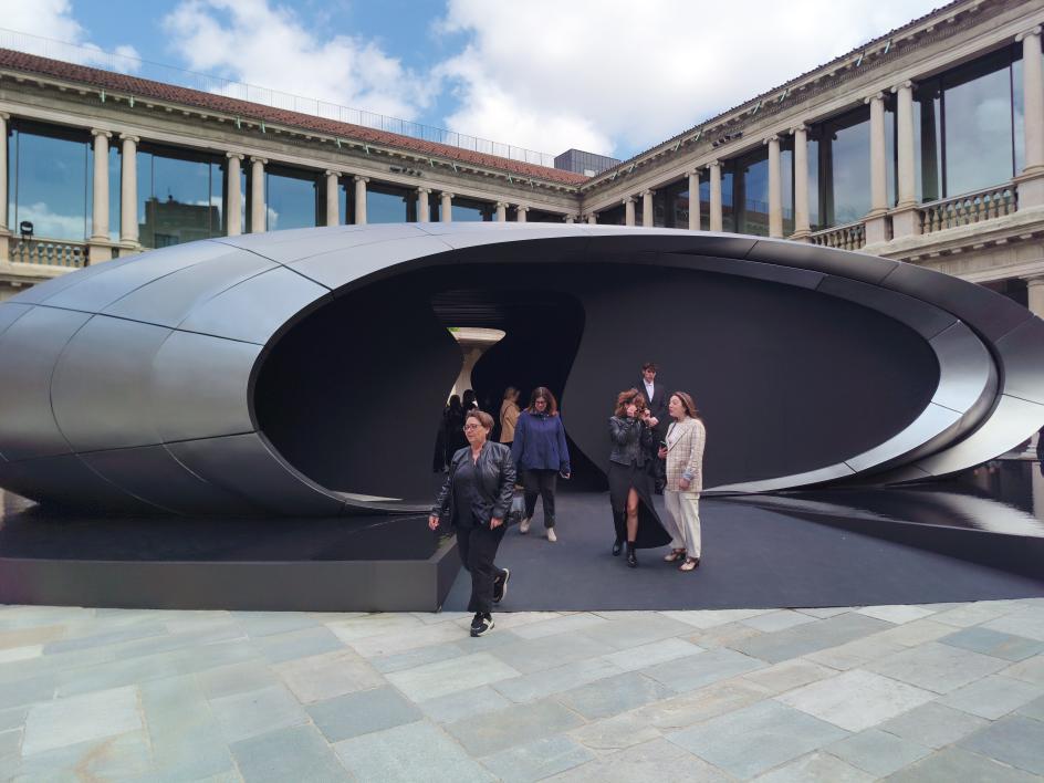 The final installation on my list was also the quietest. In the courtyard of the Portrait Hotel, Zaha Hadid Architects built The Origin for Audi: a titanium-coloured fibreglass portal set above a reflecting pool, its matte metallic surface absorbing and returning the chromatic tones of the surrounding stonework as light moved across it throughout the day. The shadows shifted. New details emerged as you move. Nothing about it was insistent.