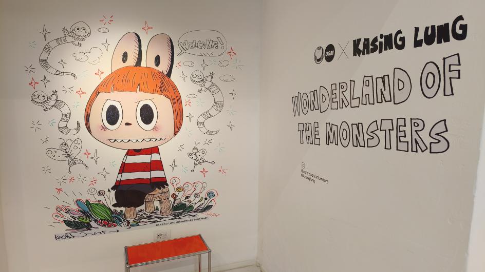 USM's clean, modular geometry served as a natural foil for Kasing's dense illustration work. His creatures and his characteristic mischief sat inside the polished chrome and coloured panels like exhibits in a very stylish cabinet of curiosities.