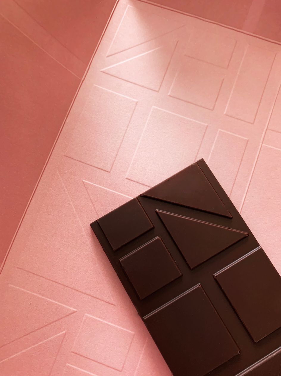 The long, elegant chocolate bar in a biodegradable corn starch wrapper. The chocolate bar itself is moulded in HN shapes, echoing the packaging, so rather than breaking off a square of chocolate, you can have half an 'N' or even a whole 'H.