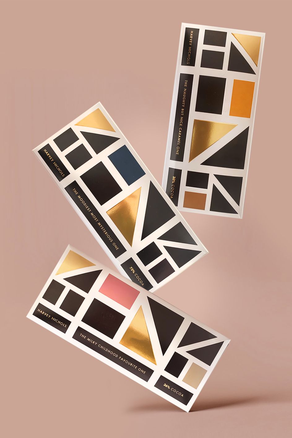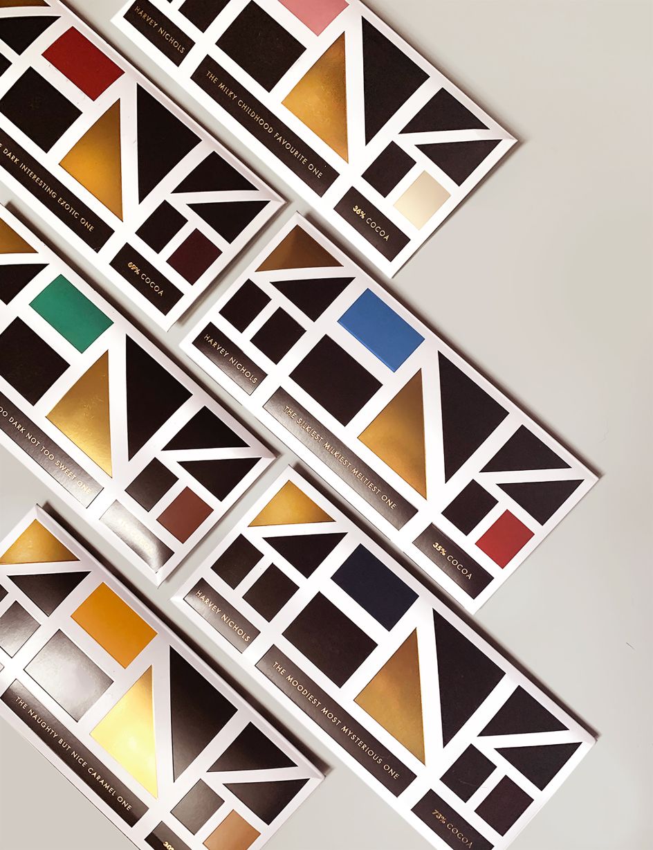 London creative agency Smith &+ Village has designed six new luxury chocolate bars for Harvey Nichols, the latest line in their ongoing reimagination of own-brand food and drink for the iconic department store.