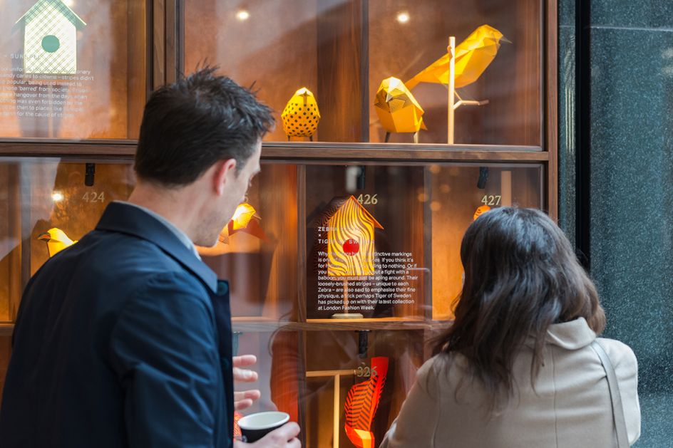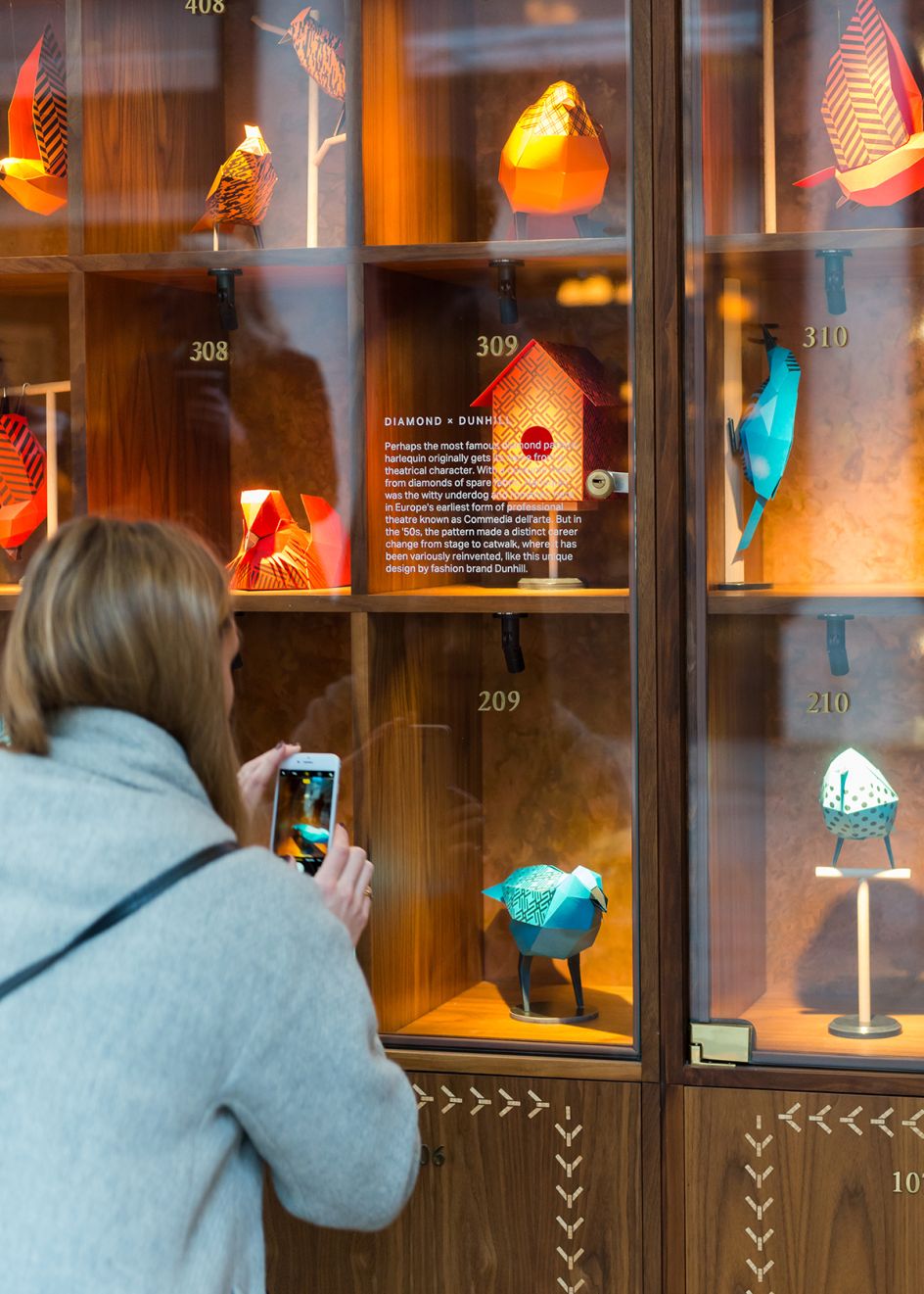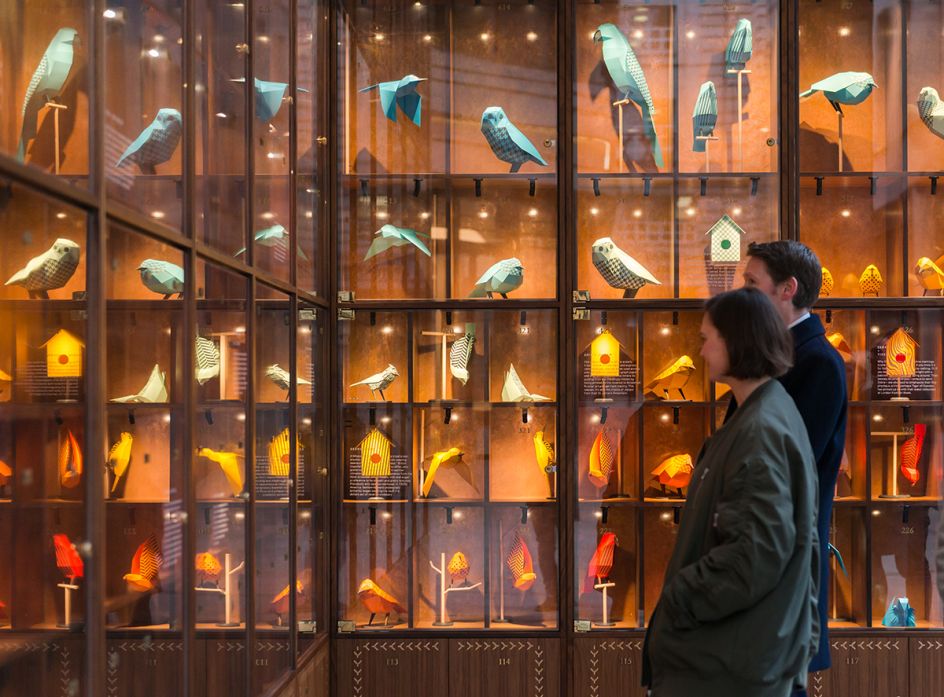 Each handcrafted bird also displays plumage and patterns inspired by the fashion houses and craftsmen of the local area. Houndstooth, checks and polka dots are taken from the fabric patterns of brands such as John Smedley, Turnbull & Asser and Aquascutum animating each paper bird. Enriching the experience further the exhibition features a curated soundtrack of birdsong.