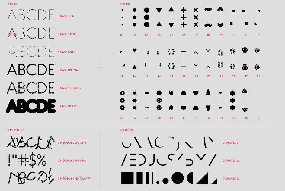 Designed by Peter Biľak and published by Typotheque, Q consists of six uppercase base fonts and 35 attachments that can be added as individual layers. It also comes with a variable font with a motion axis, as well as three levels of basic forms that can be combined into new shapes.