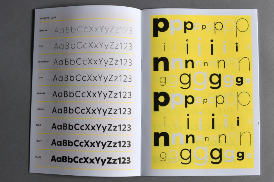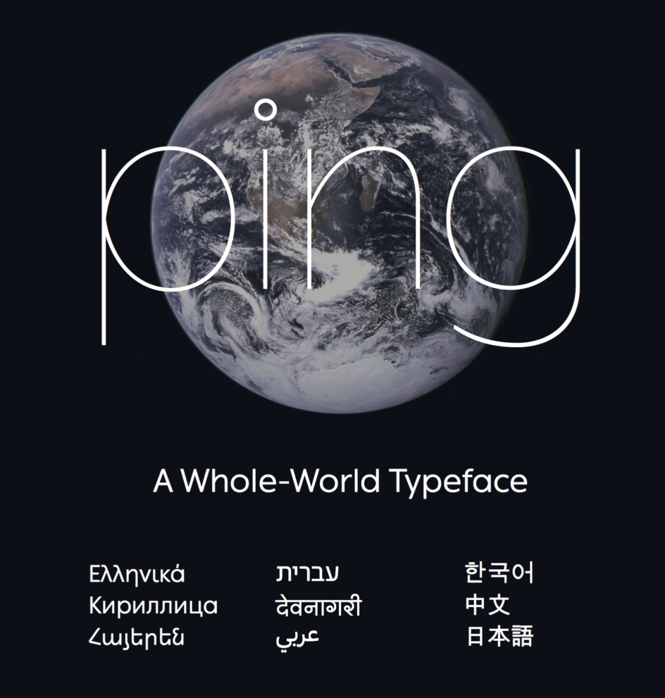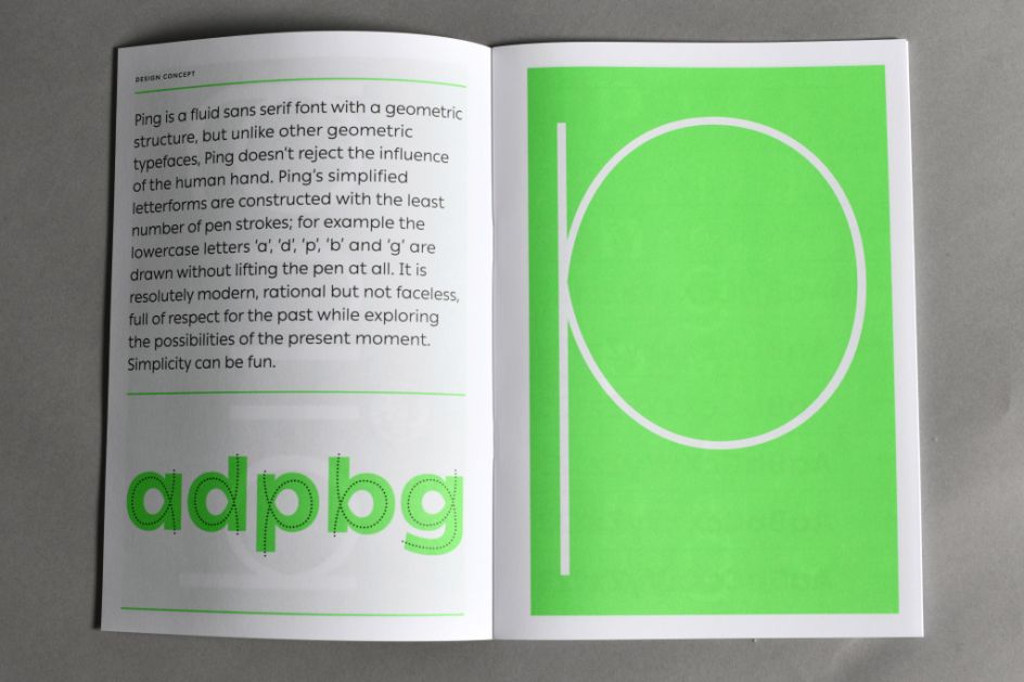 Ping reconciles two different models of constructing fonts. It appears to be constructed, but unlike typefaces like Futura, it rejects rigid or overly mechanical models, avoiding the sterility of ruler-and-compass constructions. Ping is a fluid sans serif font that embraces the influence of the human hand. Ping’s simplified letterforms are constructed with the least number of pen strokes; for example, the lowercase letters ‘a’, ‘d’, ‘p’, ‘b’ and ‘g’ are drawn without lifting the pen at all.