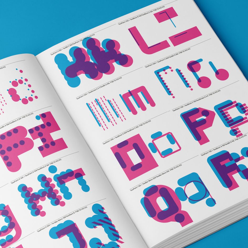 It will also share how the two type system can be worked across analogue and digital mediums, algorithmic and fortuitous forms to create a predefined and wildly unpredictable creative result – using an assortment of numbers, rules, conditions and permutations. All will be more thoroughly explained in the book – including its composition of eight family groups across the design space and tips on positioning the precise elemental alignment for typographic shapes and spaces.