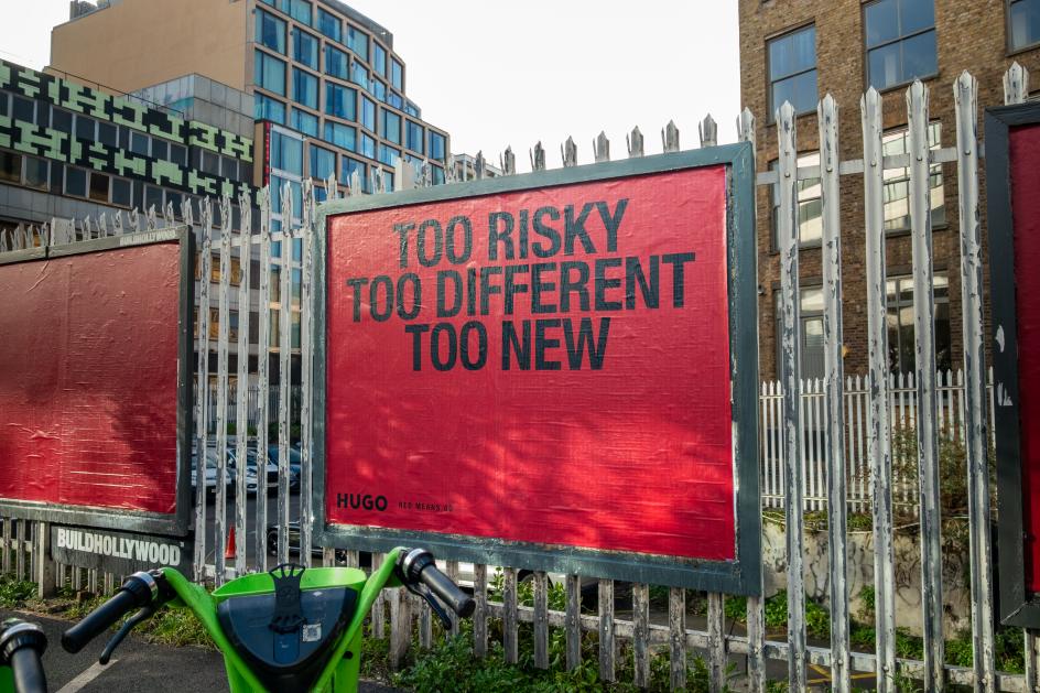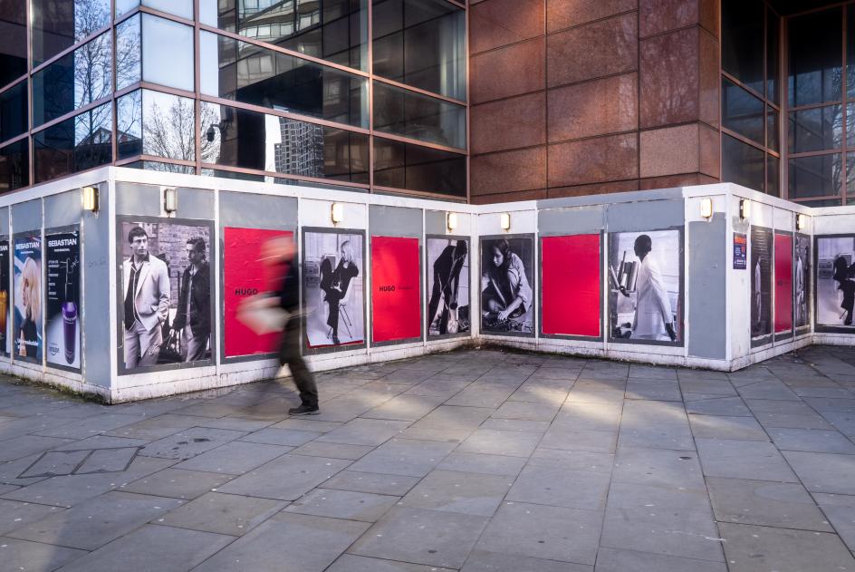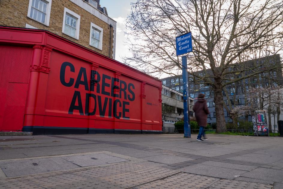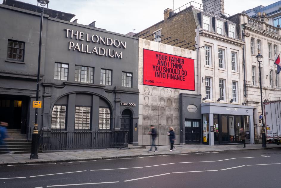What's particularly well-executed here is the deployment of the out-of-home work across London. This isn't a case of slapping the same poster in 50 locations. The placements feel considered: a building-sized "Careers Advice" wrapping a corner pub in Camberwell, the same copy appearing at the London Palladium alongside a wall of photographed faces, individual billboards scattered through East London where the creative community HUGO is actually courting and where they live and work.