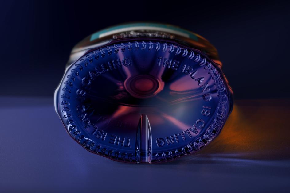 Sculpted facets at the base evoke layered feathers, and a semi-opaque blue coating at the foot creates a gradient effect, referencing Tasmania's extreme and changeable climate. An engraved stopper completes the package as a deliberate signal of quality at the moment of opening.
