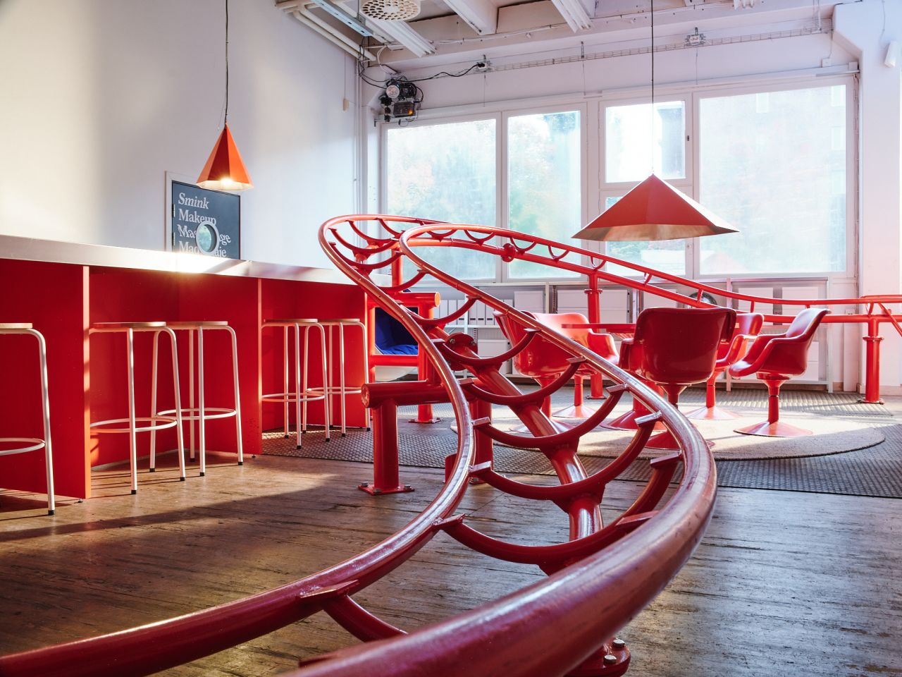 The Great Exhibition, a newly rebranded creative studio in Stockholm, has introduced The Frontal Lobe, the world's only indoor office roller coaster. The 60-metre track winds through the company's light-filled workspace in Liljeholmen, threading through areas such as the kitchen and storage spaces, creating an unexpected experience that's designed to make a lasting impression.