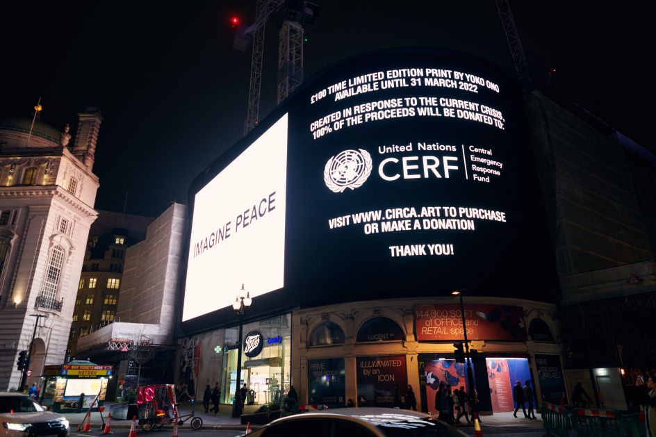 Accompanying the Imagine Peace displays is a limited edition print by Yoko Ono, available from the CIRCA site. Priced at £100, 100 per cent of the proceeds raised by the sales will be donated to the United Nations Central Emergency Response Fund, one of the fastest and most effective ways of providing humanitarian assistance to those in need.