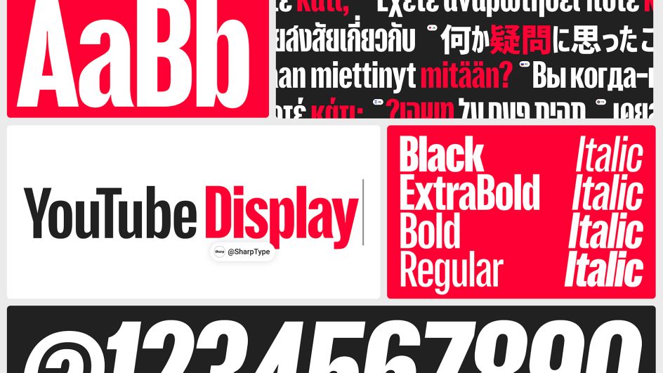 A brand new display typeface, YouTube Display, has been developed in collaboration with Sharp Type. Drawn from the geometry and equity of the YouTube logo itself, the typeface provides a consistent yet characterful voice across touchpoints. Crafted in nine global scripts, it's designed to scale across markets without losing its identity.