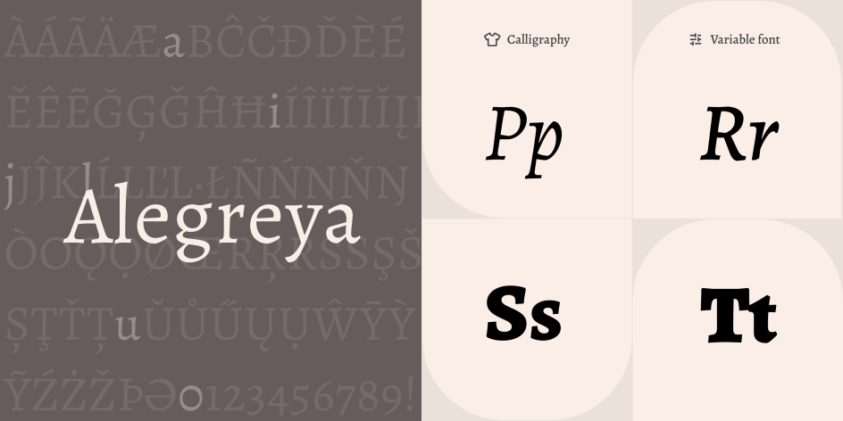 Alegreya is a typeface designed for literature. It conveys a dynamic and varied rhythm which facilitates the reading of long texts and translates the spirit of calligraphic lettering into contemporary typographic language. This 'super family', which includes both serif and sans-serif families, provides for strong and harmonious text.