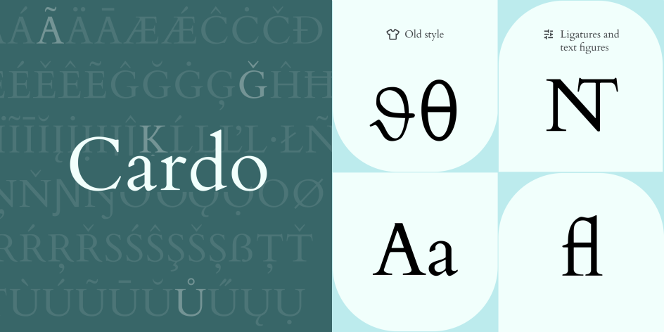Cardo is a large Unicode font specifically designed for the needs of classicists, Biblical scholars, medievalists, and linguists. It also works well for general typesetting in projects seeking an 'old-world' look. Its large character set supports many modern languages, as well as those required by scholars. The font set includes ligatures, old-style numerals, true small capitals and a variety of punctuation and space characters.