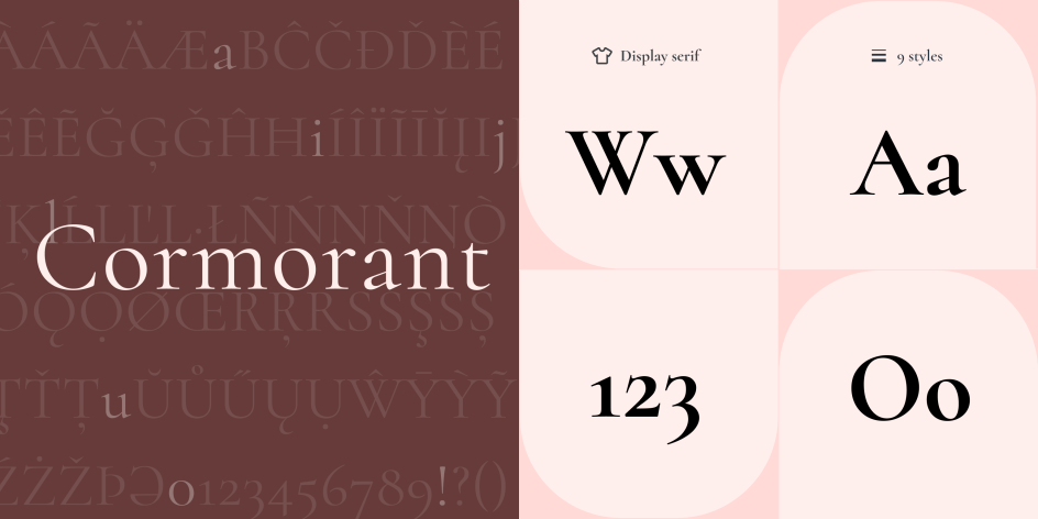 Cormorant is a serif, display type family inspired by the 16th-century designs of Claude Garamont. It comprises a total of 45 font files spanning nine different visual styles and five weights. Cormorant is the standard version, Cormorant Garamond features larger counters, Cormorant Infant features a single-story a and g, Cormorant Unicase mixes lowercase and uppercase forms, and Cormorant Upright is an italic design.