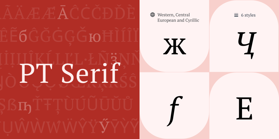 Released by ParaType in 2010, PT Serif is a pan-Cyrillic font family. A transitional serif typeface with humanistic terminals, it's designed for use together with PT Sans and is harmonised across metrics, proportions, weights and design. Regular and bold weights with corresponding italics form a standard font family for body text. Meanwhile, two caption styles in regular and italic are for use in small point sizes.