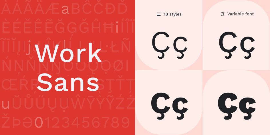 Based loosely on early Grotesques, such as those by Stephenson Blake, Miller and Richard, and Bauerschen Giesserei, Work Sans is simplified and optimised for screen resolutions. For example, diacritic marks are larger than how they'd be in print. The regular weights are optimised for on-screen text usage at medium sizes (14-48px), while those closer to the extreme weights are more suitable for display use.
