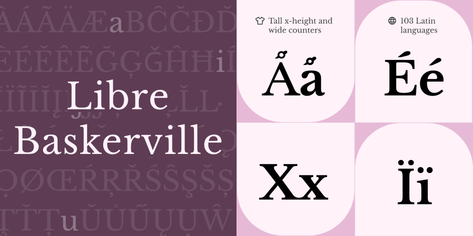 Libre Baskerville is a web font optimised for body text, typically 16px. It's based on American Type Founders' 1941 classic Baskerville but has a taller x-height, wider counters and a little less contrast, allowing it to work well for on-screen reading.