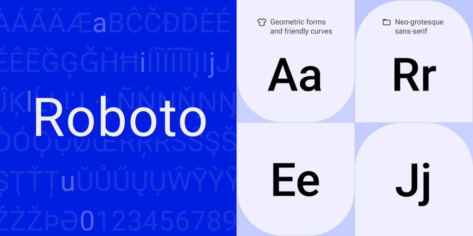 Roboto is a neo-grotesque sans-serif typeface family originally developed by Google as the system font for its Android operating system. It has a mechanical skeleton, and the forms are largely geometric, featuring friendly and open curves. Providing a natural reading rhythm more commonly found in humanist and serif types, the regular family can be used alongside the Roboto Condensed family and the Roboto Slab family.