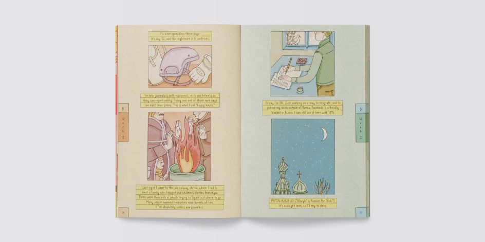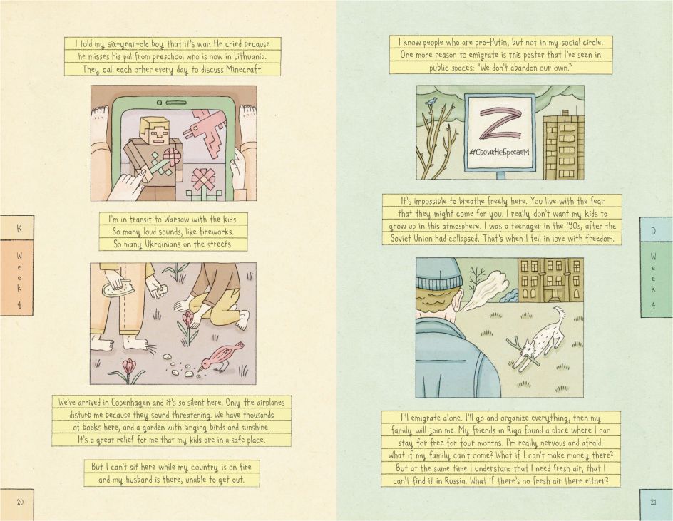 K, a Russian-born Ukranian journalist, and D, a Russian artist from St. Petersburg, communicated with Nora via phone chats over the course of a year. These conversations were then condensed and constructed into a narrative with the help of accompanying illustrations. Their personal account offers a unique insight into the conflict, with the epistolary format providing a sense of rawness not found elsewhere.