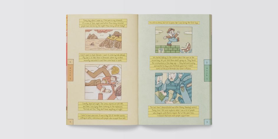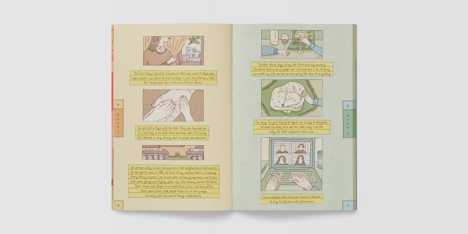 She understood that, unlike what she had read about the war in the media, the personal accounts of individuals might provide a more emotional entry point into understanding the devastating impact of the conflict. "I asked K and D if I could interview them about their experiences to create a weekly illustrated diary that would juxtapose their individual, contrasting voices and that would be sold to newspapers to raise awareness and funds for the victims in Ukraine. Both immediately agreed."