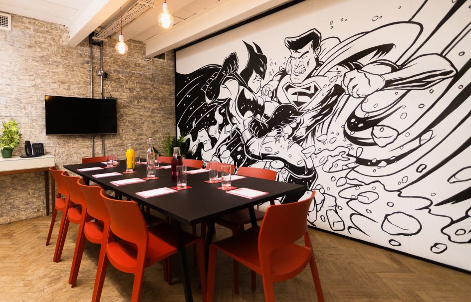 Another favourite is the striking, pop-art style, Batman and Robin mural that adorns the wall of one of our meeting rooms. This came about through our partnership with Creative Debuts, a platform that aims to improve the working environment by showcasing inspiring art from young emerging artists in workplaces. They’ve transformed the walls in our Hatton Garden space in the process and showcase new artwork every few months. Members can even buy anything they discover.