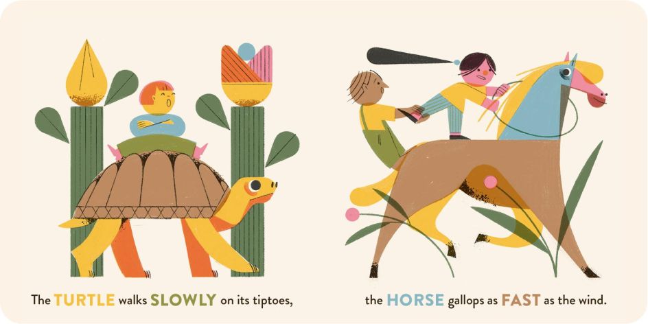 He's not just lent his talents to the pictures either. Marco has also designed and realised the text which runs underneath each page. And by picking out the names of animals and their corresponding activity in larger, specially-designed colourful type, even the youngest of readers will be able to form a connection between the words and pictures. And most importantly of all, they can carry their newfound appreciation for our animal friends over into the real world too.