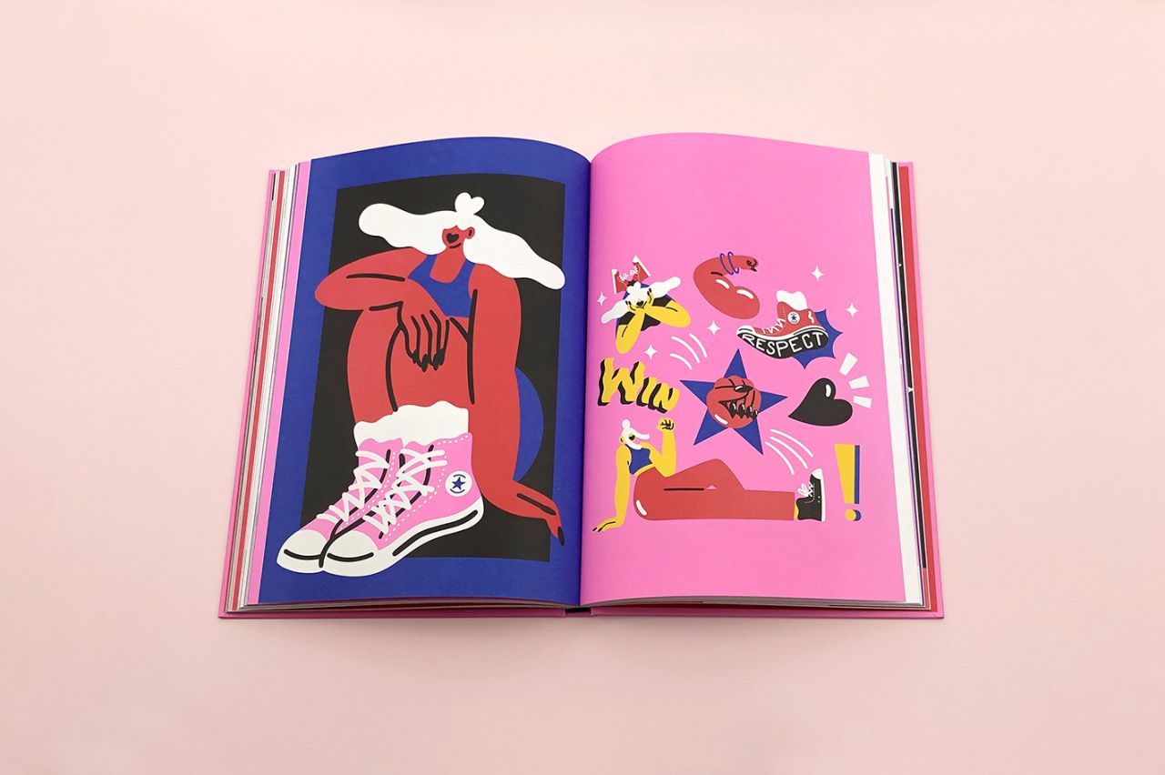 Printed entirely out of Pantone colours, which most certainly captures the vibrancy and joy present in her illustrations, the book shows us why Marylou's career has been so successful thus far. Specialising in character design, she has a playful and cheeky style that's instantly recognisable and has led her to work with many global brands. Interestingly, her clients tend to focus on social or ethical causes. A prominent theme in her work is the advocacy of equal rights for all and a strong representation of women. Her characters convey numerous qualities of femininity, be that playfulness, sensuality, strength or innocence. Without eyes to express such emotions, she cleverly employs body language and positioning to portray a mood. The results, in their own quiet way, challenge notions of beauty and femininity.