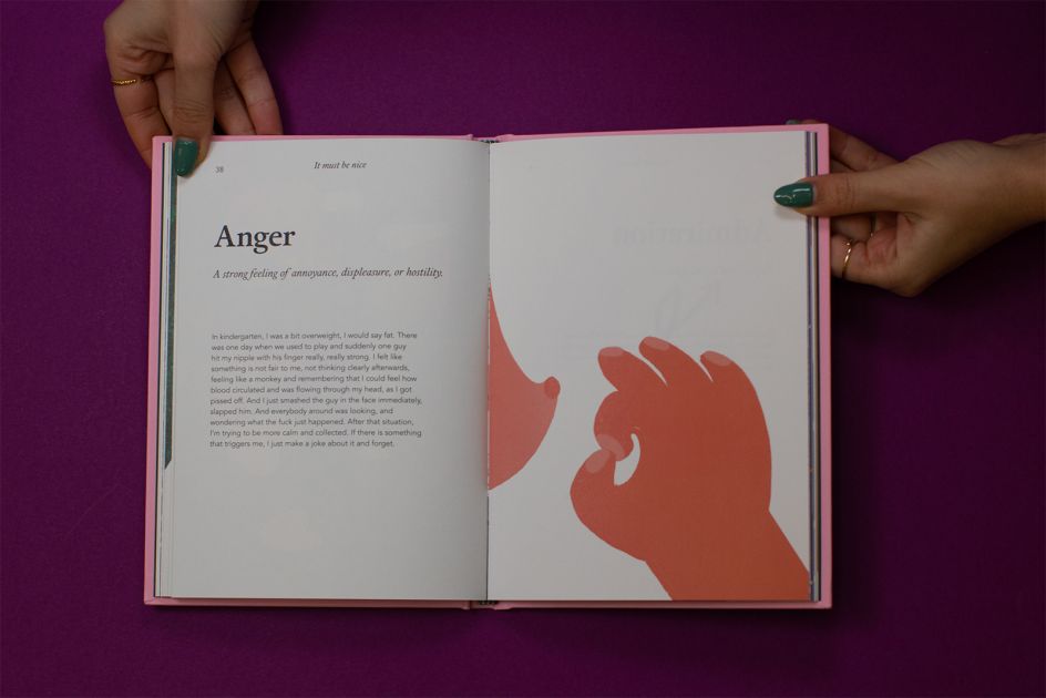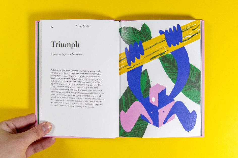 To bring these feelings to life, Ričards interviewed 27 people from all over the planet and created accompanying illustrations. Whether it's Dave from Italy sharing a memory about empathy, or Hebe from Nicaragua describing her satisfaction while playing her bass guitar, each personal account is loaded with sincerity and honesty.