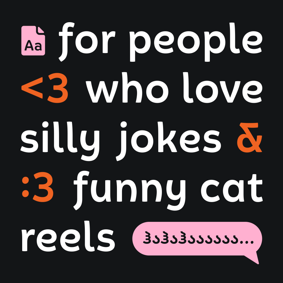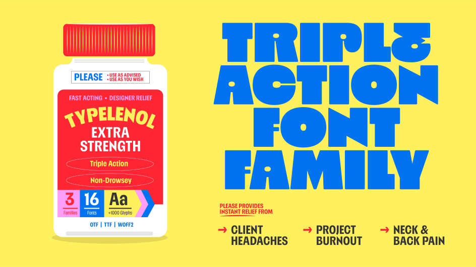 At the extreme end—the Poster subfamily, running from Heavy to Jumbo—things get, as Caneso puts it, "delightfully strange". Exaggerated counters and bold shapes produce forms that hover between familiar and alien, functional and purely expressive. Ultimately, Please rewards those willing to push it, offering one typographic personality at comfortable display weights and an entirely different one at the limits.