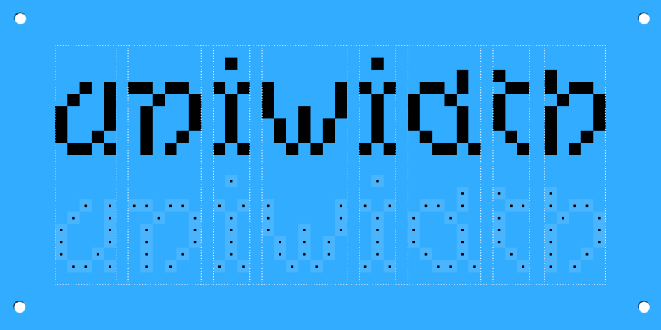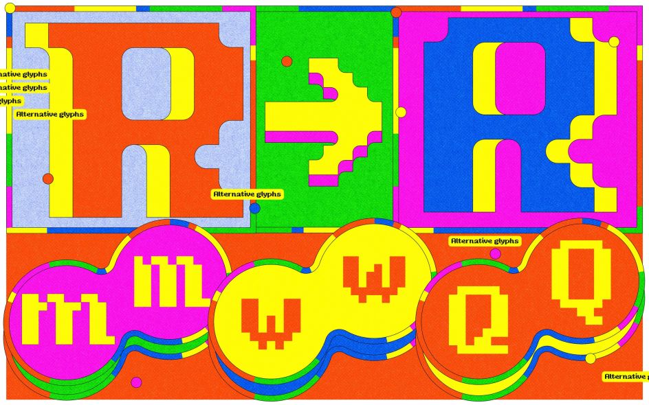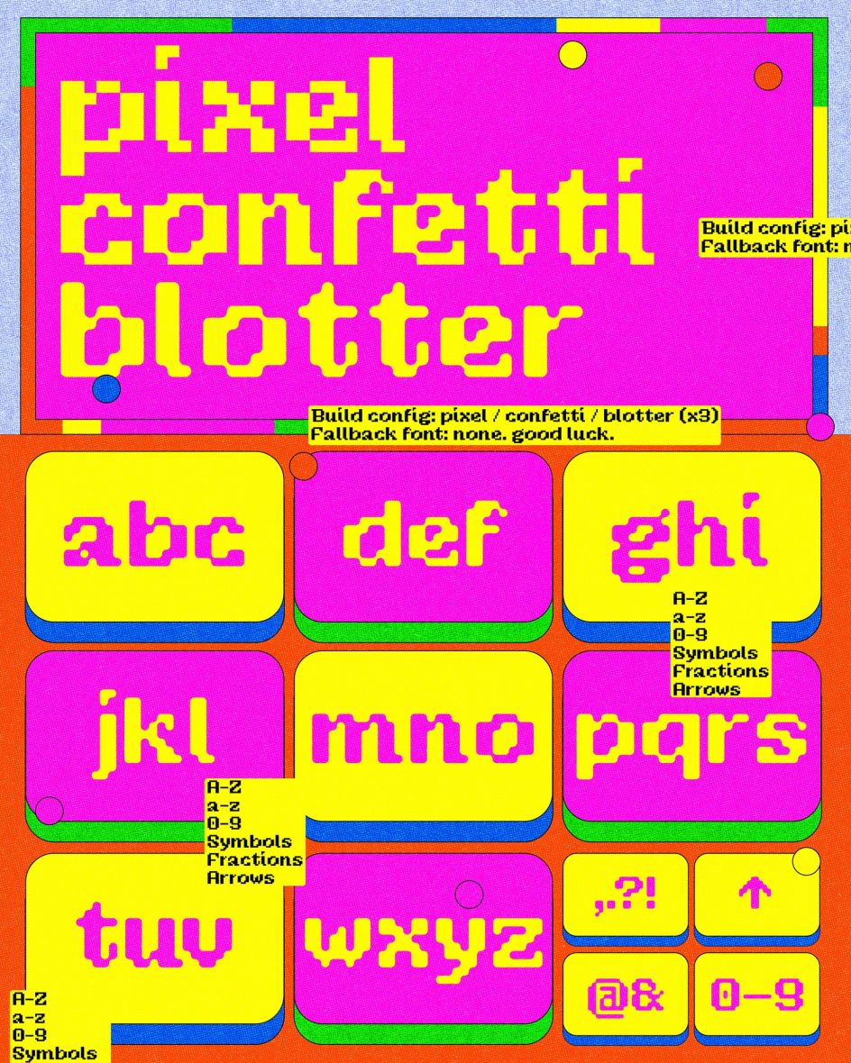 The grid imposed what Mazzarella describes as "brute, binary limitations": a sharp contrast to the refined micro-decisions of professional type design. But rather than correcting for the unexpected quirks that emerged, she made them design decisions. Width variations that might otherwise have been smoothed away became contextual alternates; initial capital forms were added where they felt right. What began as pedagogy became a full display family of three styles: Pixel, Confetti and Blotter, each approaching the same 8×8 core from a slightly different direction.