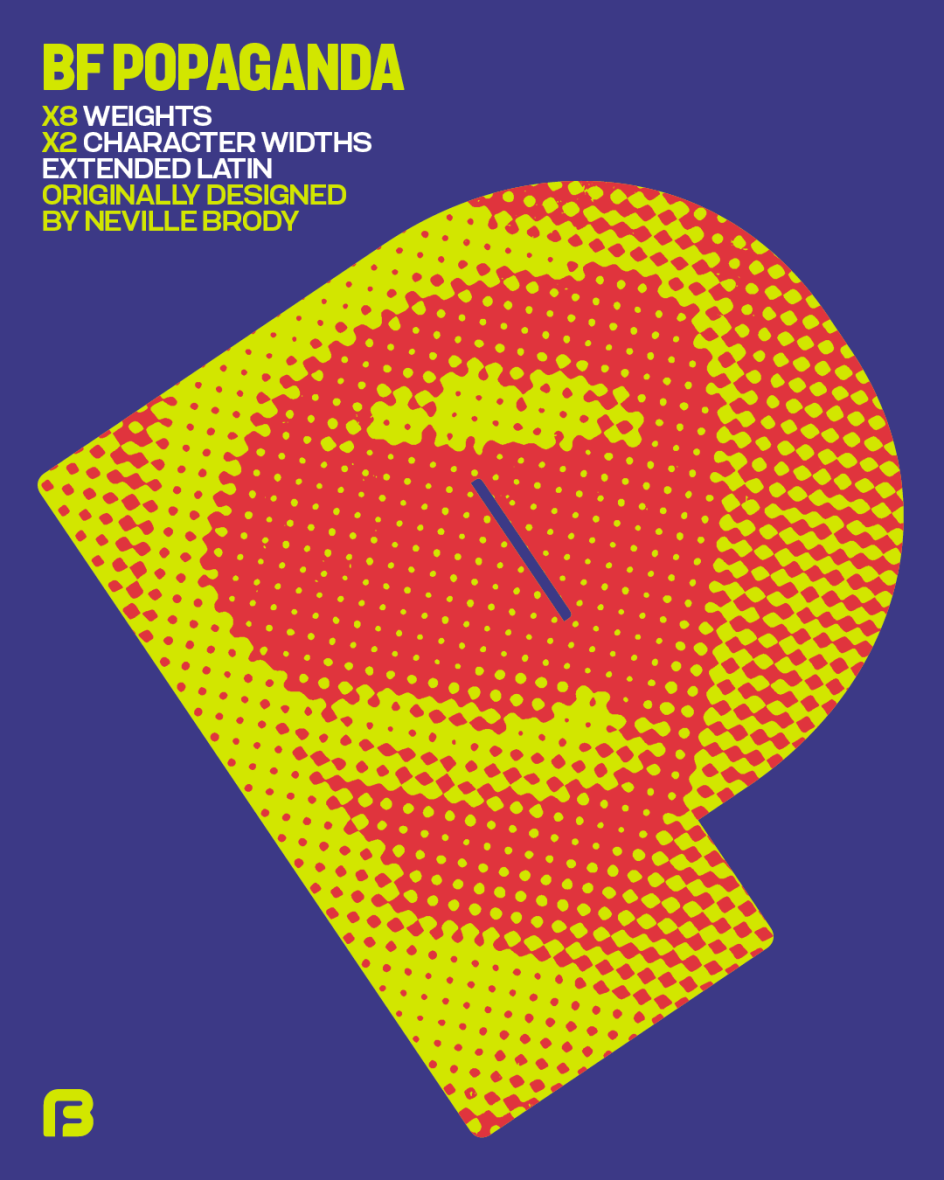 Since its debut, BF Popaganda has been expanded into a broader range of weights, 16 styles in total, and is now available for purchase via Type Network for the first time. The expansion gives the typeface a range it previously lacked, making it adaptable across a wider span of applications without compromising its confrontational personality.