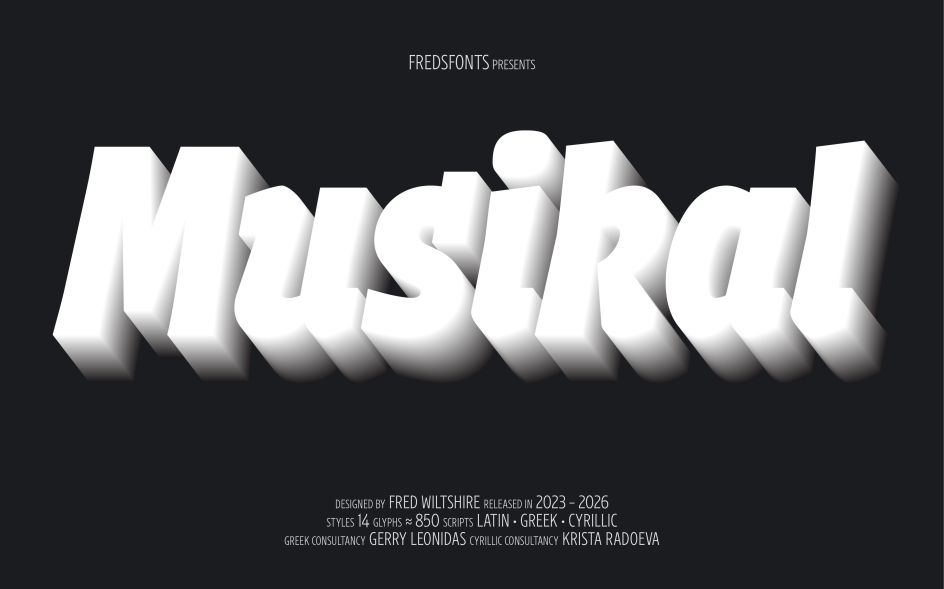 After three years in development on Future Fonts, Fred Wiltshire's Musikal has reached v1.0: a significant milestone for a typeface that began with a conscious act of divergence. Herman Ihlenburg's Obelisk (1880s) served as the starting point: a high-contrast, ornamental display face of considerable geometric rigour and decorative confidence. Rather than reviving Obelisk directly, Wiltshire took its "playful nature" as a conceptual springboard and built something clearly of the present.
