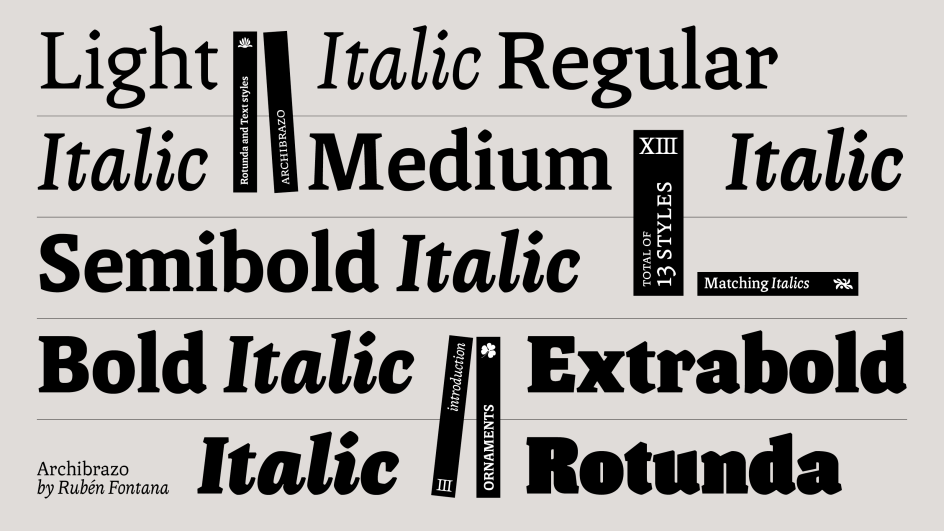 Seven weights address the full span of typographic application, from refined running text to assertive display work. Sculptural wedge serifs and carefully carved countershapes drive the family's optical performance, creating clear differentiation between strokes and contributing to the legibility that Fontana has positioned as central to the design. The Archibrazo Rotunda weight occupies a special position within the family; a heavier, rounder voice well suited to titling, branding and poster work, where presence matters as much as precision.