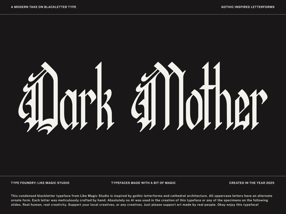 Dark Mother occupies a corner of the typographic landscape that rarely appears in monthly round-ups: the condensed blackletter, executed with contemporary restraint.