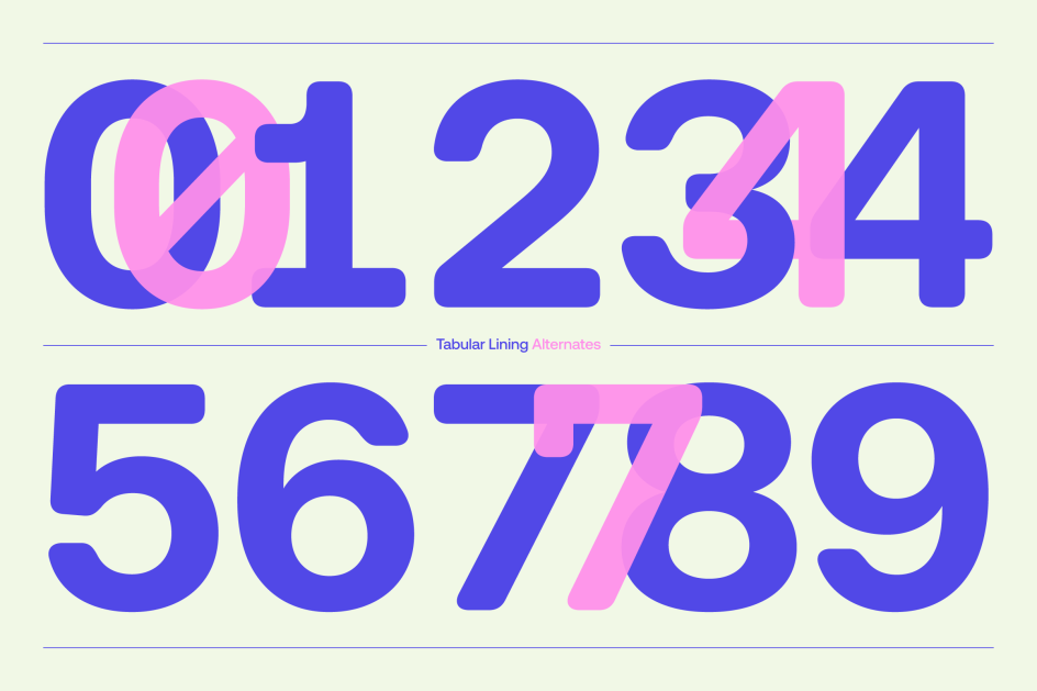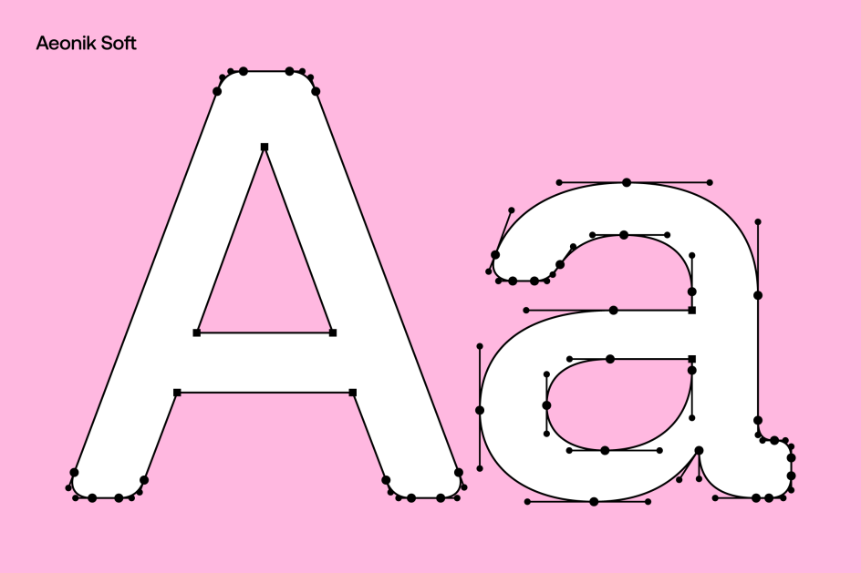 This isn't a rounded typeface in the conventional sense. The mechanical backbone remains largely intact; what changes is its emotional register. Subtly curved corners replace the harder edges of the original, creating a version that feels more expressive and conversational, but never informal. The result is particularly well suited to editorial work, identity systems, packaging and children's content; contexts where Aeonik's modernity benefits from a gentler touch.