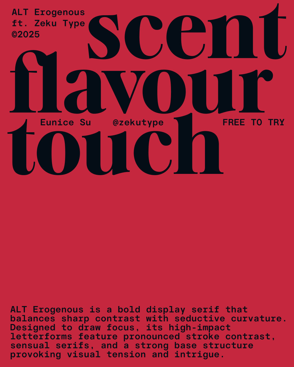 As a display serif, ALT Erogenous works through controlled contrast. Sharp, high-contrast strokes sit alongside seductive curvature; stylistic sharp terminals contribute to a visual tension that feels simultaneously confrontational and refined. The strong base structure anchors forms that might otherwise feel too volatile, creating a typeface that is emphatically designed for unapologetic display use.