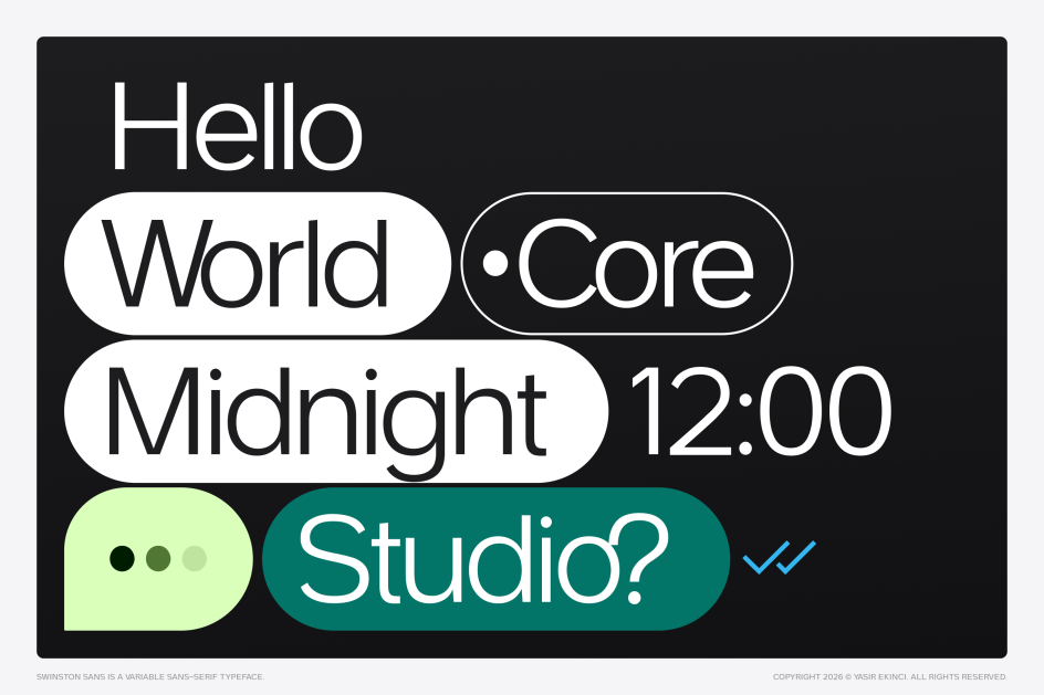 Its signature detail is 15° angled terminals, which give Swinston a distinct visual rhythm that persists across the weight range, preventing the neutrality that afflicts so many geometric sans serifs when pushed toward the light end of their axes. The generous x-height, open apertures and balanced counters ensure legibility at small sizes without sacrificing presence at large ones.