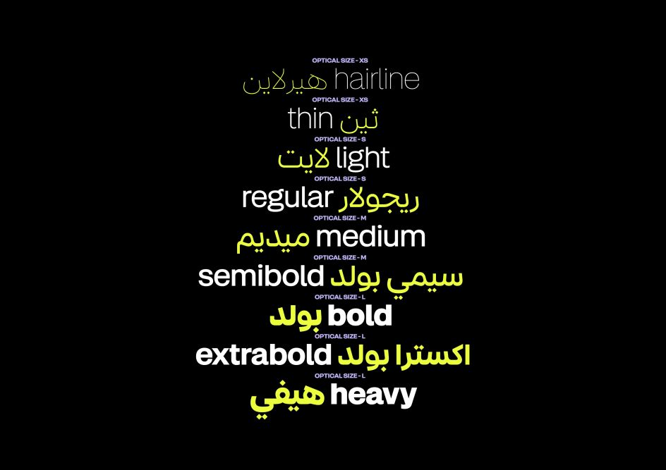 The family matches its Latin companion, Sets Grotesk, in breadth: nine weights across four optical sizes. Whilst smaller text sizes recede appropriately into background readability, the large optical size undergoes a complete personality transformation. Character skeletons widen, connections shorten, counters expand. The result is typography designed to capture attention and stand out, with long teeth, larger dots, and wider proportions that create a distinctive presence.
